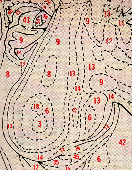I had never really noticed it before, but when I looked closely at some of the detail in the work it suddenly dawned on me that the central part of the work was an eyeball--this no doubt instantly seen by every other person, but for me it was a shock of recognition. This became particularly clear when I (quickly and clumsily) photoshopped out most of the elements of the painting, leaving me with this: