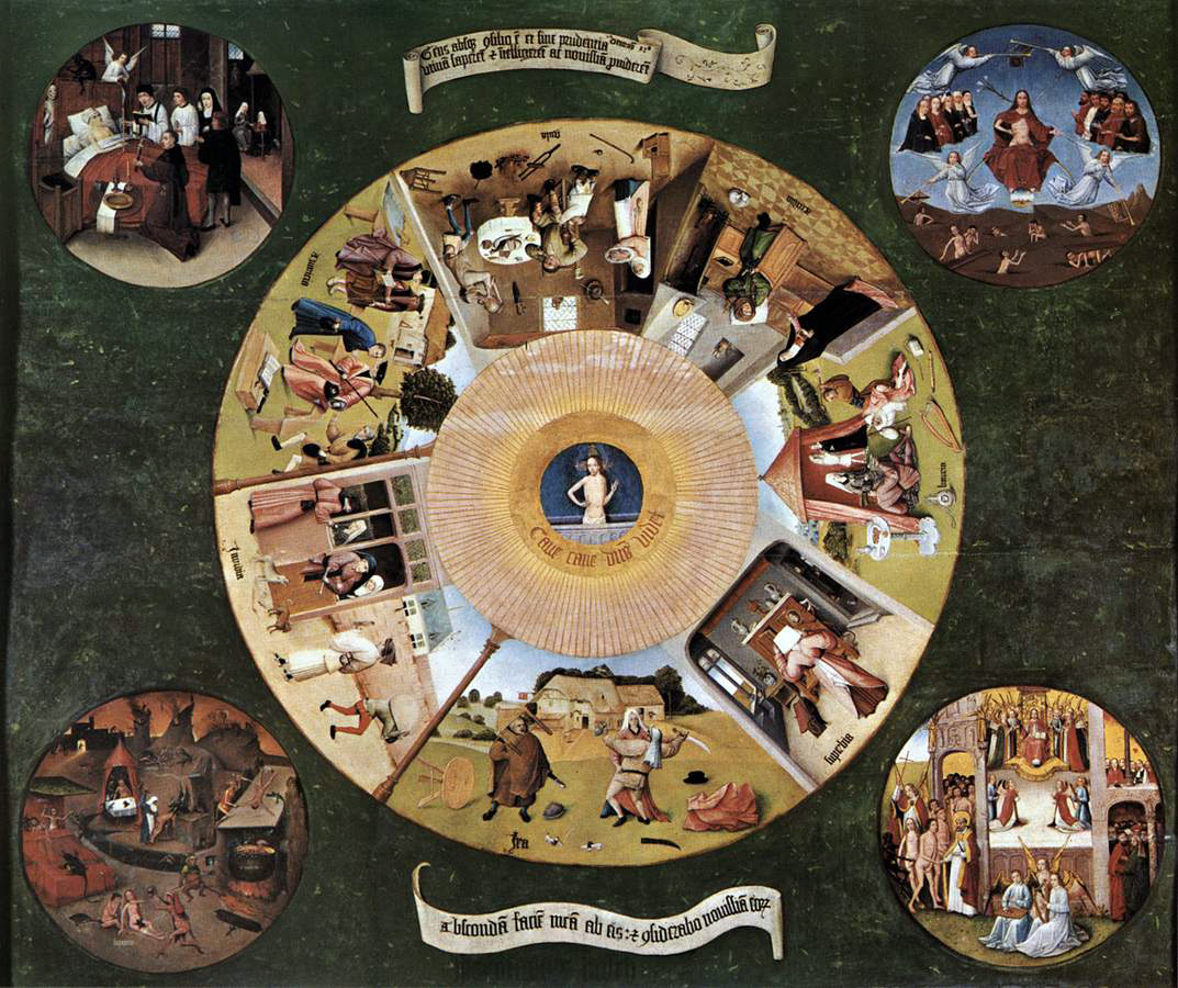 The motif of the painting clearly works its way outside-in, with the all-seeing omnipotent being seeing-all, there at the center of the eye, surveying everything that takes place on the living dominion, surrounded at the corners by depictions of Death, Judgment, Heaven, and Hell, and then immediately encompassed by the seven deadly sins.