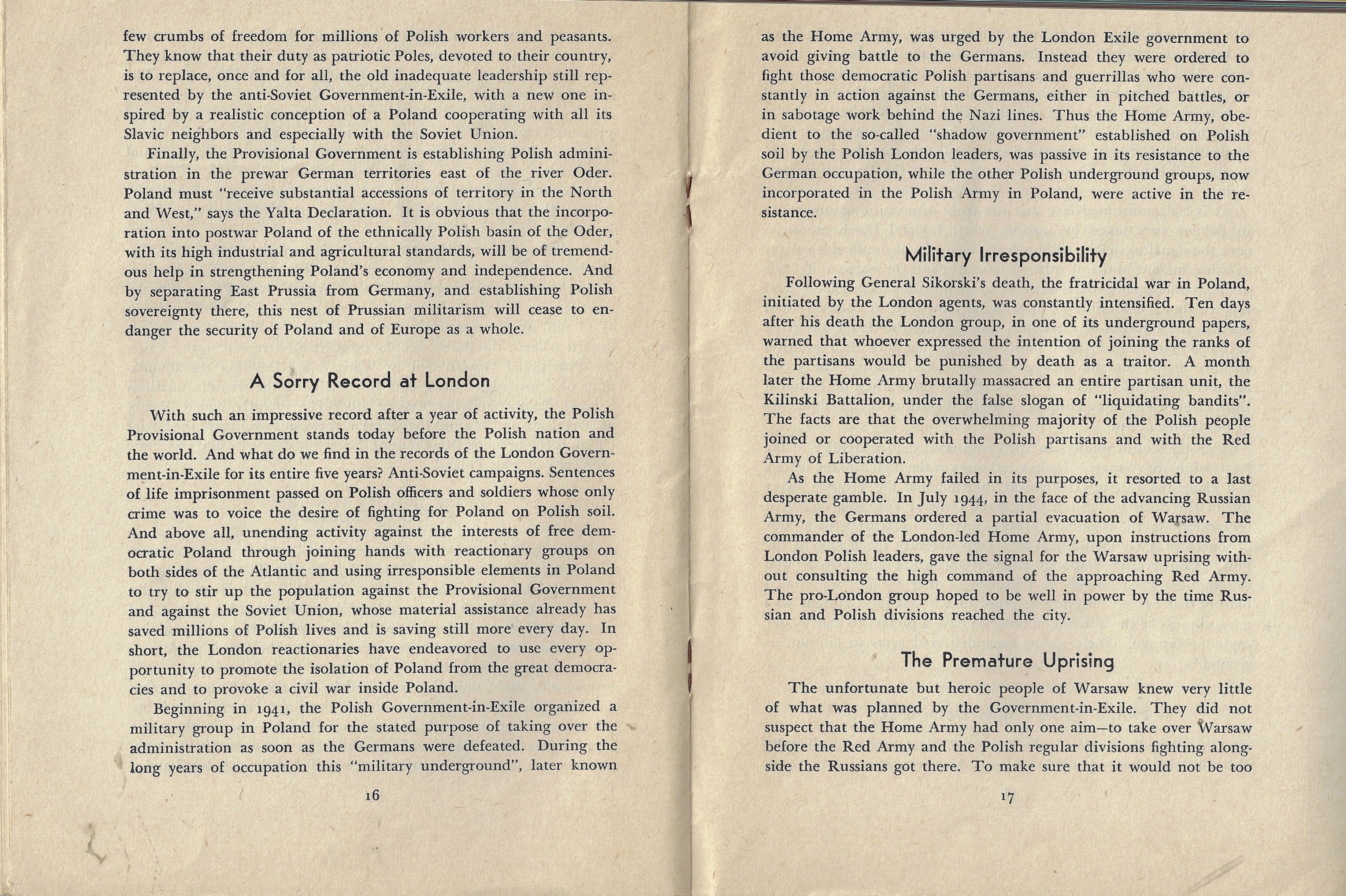 There's a lot of difficulty in this work's 29 pages, all of which are ultimately directed against the still-extant Polish government in exile (in London) insisting that those are the anti-democratic and anti-Soviet forces at work in Poland. The write, a physicist named Ignace Zlotowski is the author, and he makes an abundant case for the London government setting out to destabilize (and de-Stalinize) the “New Poland”.