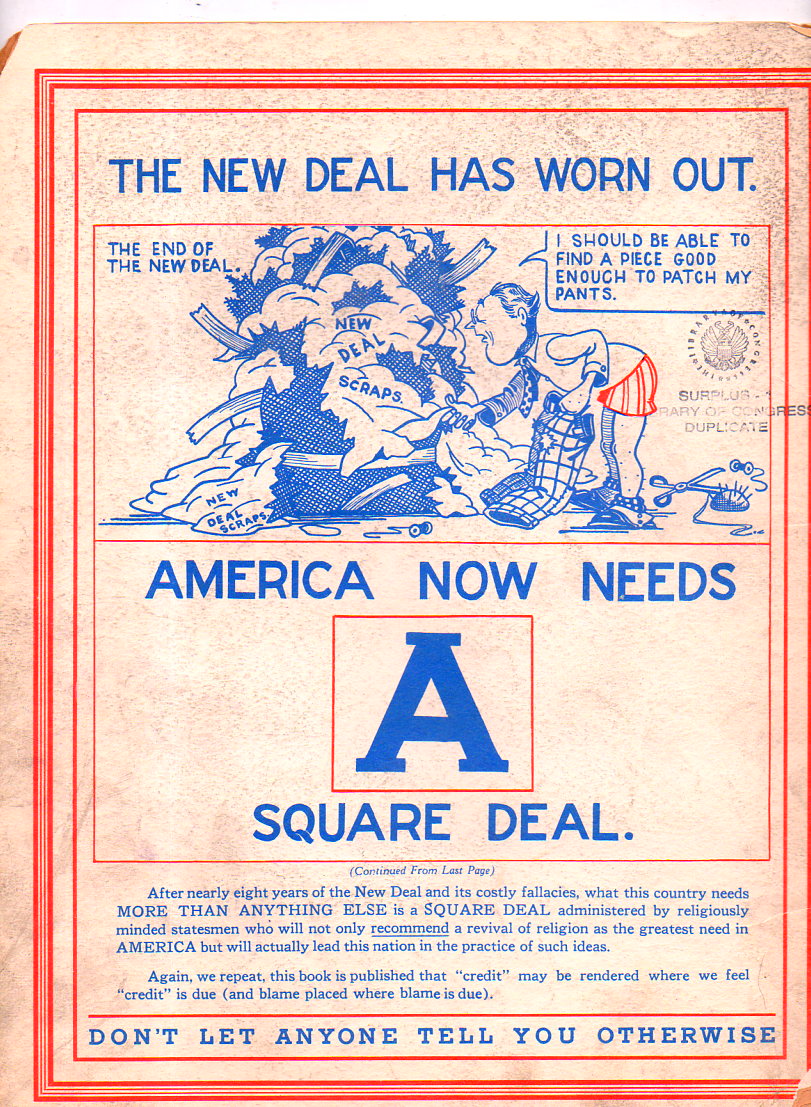 This is a nasty (pronounced nazty) piece of work by the loftily-named League for Constitutional Government, comparing Roosevelt's New Deal legislation and program to an overall regime for world domination under Socialist and Communist dictums/control. Everything is Communist, and whatever wasn't Communist was Socialist, and there really wasn't to much of a distinction in anything, except that under everything else were the Jews. It is rough and bumpy work, not well written, not well thought-out, though there was a lot of action that was taking place between the badly-formed lines, and if you looked a little hard at it everything starts turning up Fascist.
