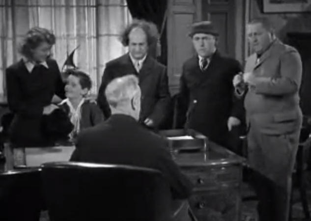 My polymathic friend Eric Sacharaow clued me into a wonderful image in the history of motion pictures: an encounter between The Three Stooges and Franklin Roosevelt. It occurs at the end of a movie short The Boys made in 1937 (which was evidently shot in four days) called Cash and Carry, in which (after hijinx [is this a Scrabble word?]) they pursue a hidden treasure to fund a crippled boy's operation and wind up tunneling into a federal gold vault. They are caught, other stuff happens, and then they are in the Oval Office (for some reason located in the U.S. Capitol building), where they wind up being heroes of some sort. They appear with an actor playing the role of FDR with the president sitting with his back to the camera, the other actors facing towards the camera, speaking to the seated president. The Stooges are absolve because their pursuit was pure, with FDR announcing “executive clemency”, to which Curly responds, “Oh no, not that!”.