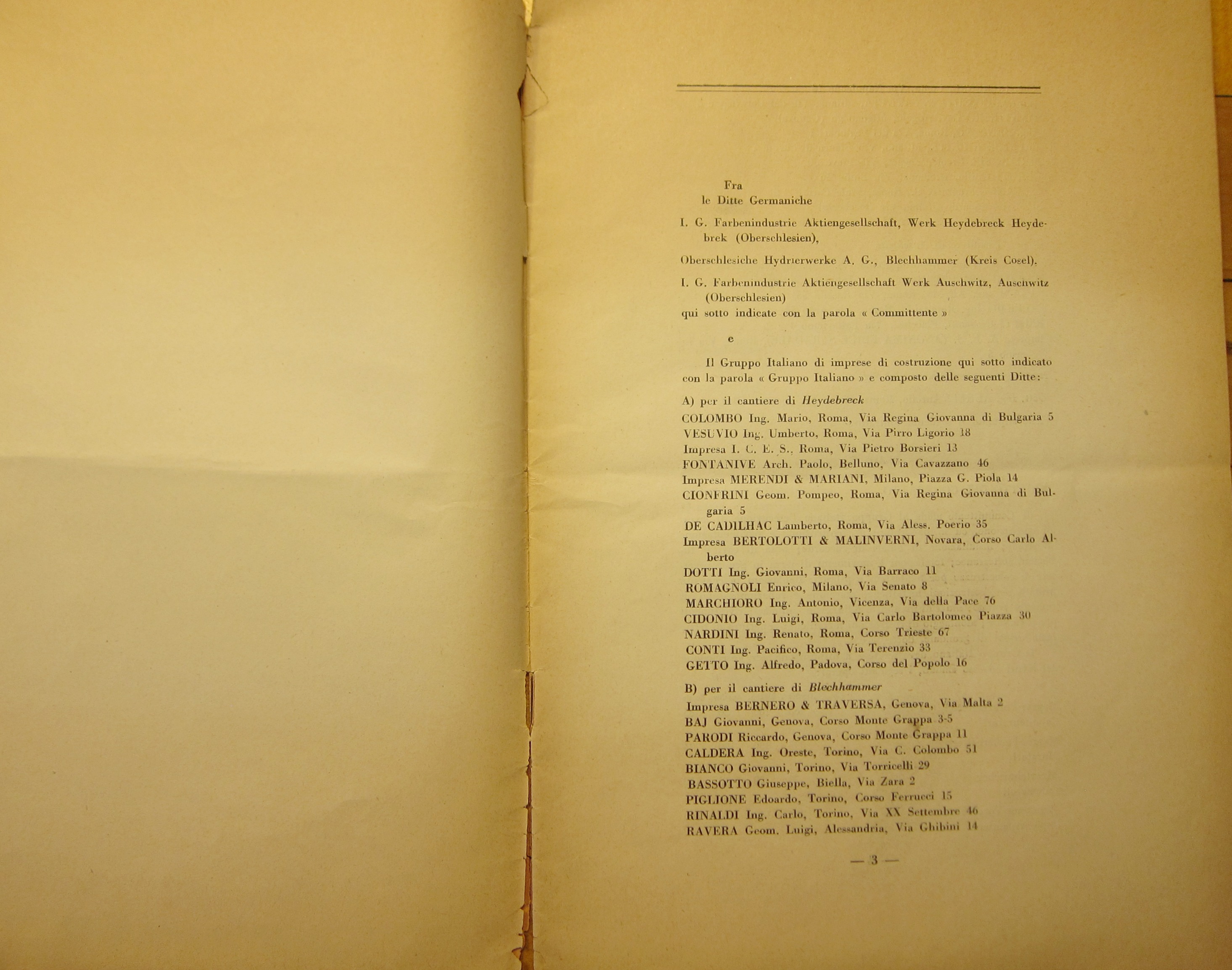Contratto per l’escusione di lavori di construzione in partecipazione con imprese germaniche, nei cantieri di Heydebrek, Blechhammer e Auscwitz (contract to perform construction work in participation with German companies, in the yards of Heydebrek, Blechhammer and Auschwitz) It was printed by Tipografia del Gianicolo, in Rome, 1942, by the Confederzione Fascista degli Industriali, Federazione Nazionale Fascista Raggruppamento Germania. The document measures a fragile 30.5 x 21 cm, and is 29 pages long. Like dozens of thousands of other things here at the store, this was formerly in the “Pamphlet Collection” of the Library of Congress (which received the publication 12 July 1945) until we purchased the collection at the end of 1999. The full document is reproduced below.