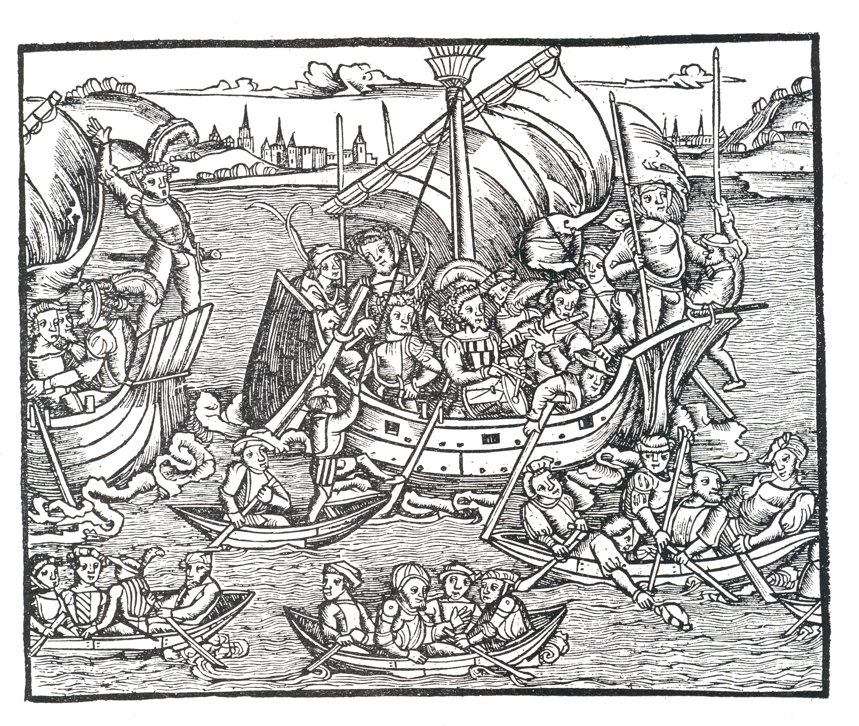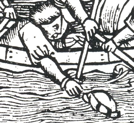 And in looking at this fantastic work by Livy, I am a little embarrassed to find this spectacular bit of human tendency displayed in this woodcut depicting a naval engagement during the Punic Wars. It is a beautiful thing, this scene of warfare depicted on tranquil seas and ribbony waves, determination in every face. But what I noticed in the small boat at bottom right is a man reaching out into the water—not for a dropped oar, or to help a man overboard, or to catch his falling sword.