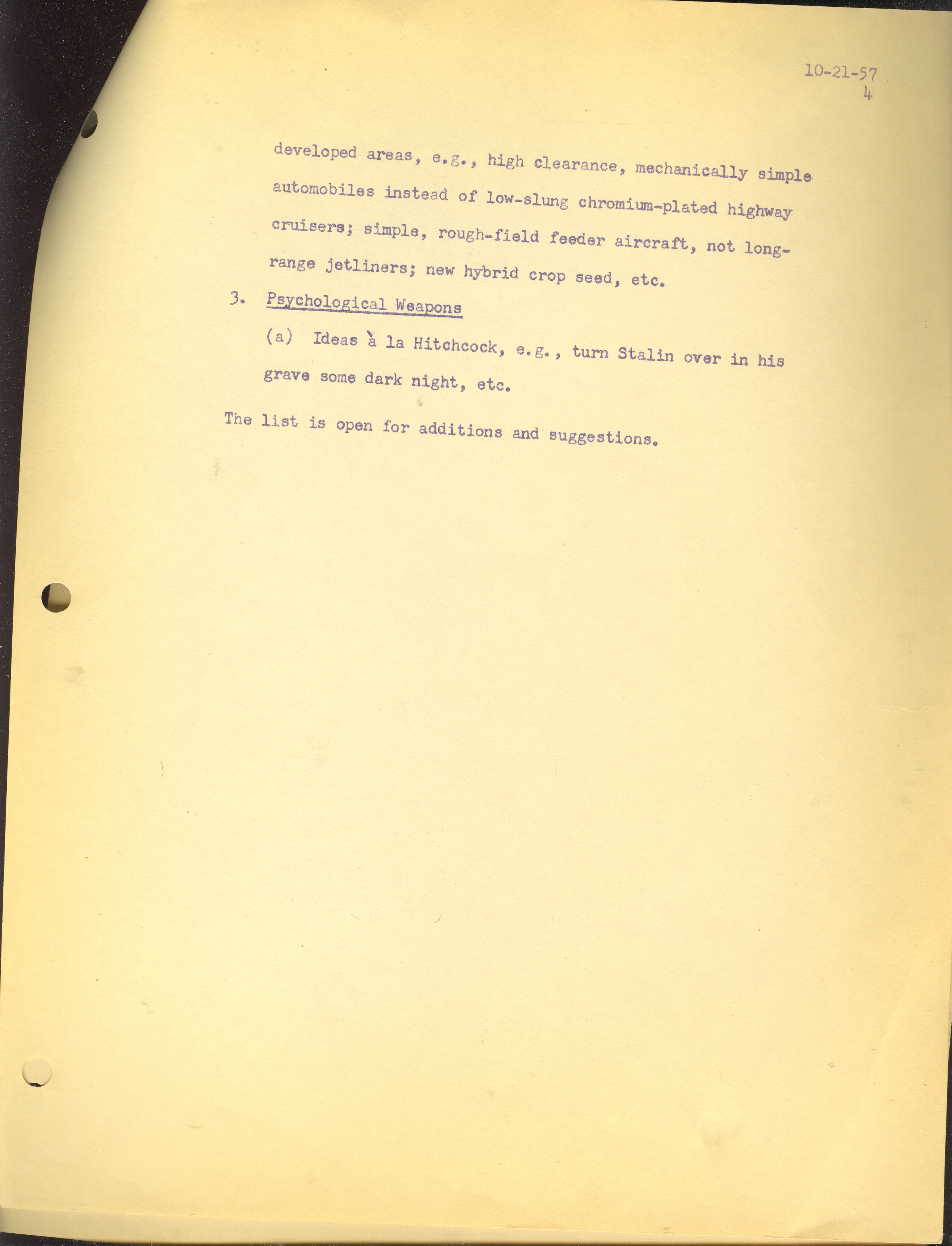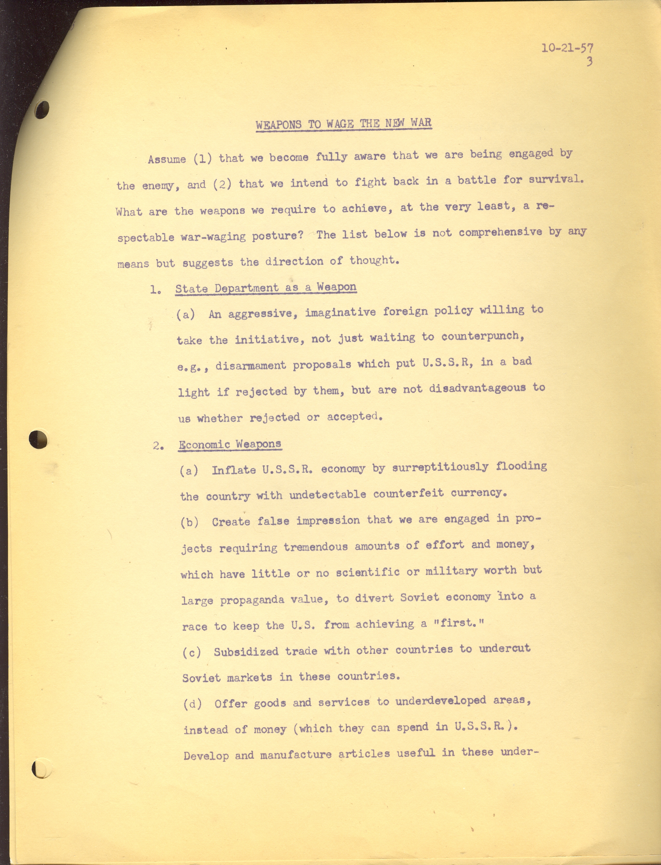 This publication is an internal RAND document, not meant for the eyes of the outside world, at least in 1957. I own a number of these reports, and I must say that this one is odd—it is rather flippant, sometimes oddly and darkly (dare I say it?) funny. It is also short (four pages) and gets to the very meaty part of the issue immediately. The author(s) assume that the US and the USSR will have achieved a point of stasis such that it would make absolutely no sense for either actor to actually employ their arsenal (and excluding “the possibility of the button pusher ‘flipping his lid’ “. The paper attempts then (“let’s jump right in and assume we find ourselves in this stalemated period”) to envision the next kind of war in which the ICBM would not be an active factor. “We therefore postulate here that the kind of war we will be engaged in…in the period of nuclear stalemate of the non-violent war, the opening phase of which has been called the cold war.”