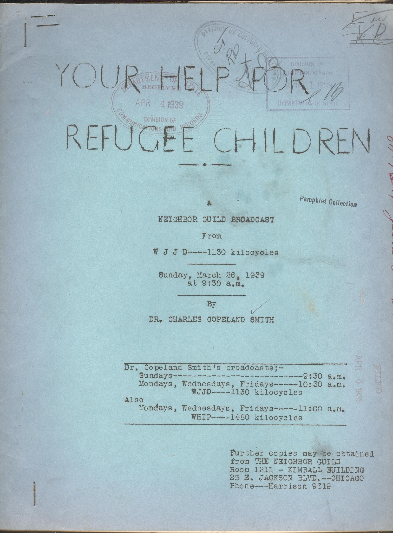 Your Help for Refugee Children (March 1939) is the text for a radio broadcast by Chicago-based Dr. Charles Copeland Smith for his “The Neighborhood Guild” series. Actually, Smith gave the broadcast over to his wife (for some reason) to make this appeal-- I guess because the subject was children, and that it would best be made by a woman. Mrs. Smith made the case for the relaxation or extension of American immigration policy to accommodate the newly-minted refugees of Hitler’s Nazi Germany.