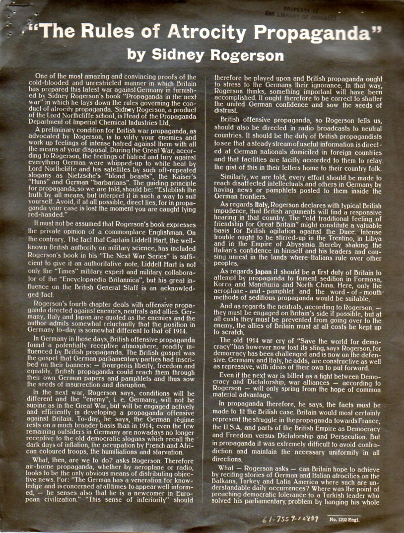 As a small cog in the machinery of the Nazi Big Lie, this short sheet (supposedly written by a " Theodore Kesselmeier"1), outlines a campaign of British anti-Nazi psychological warfare, and was written around 1938/9. It is written in a book review format whose aim was the 1938 publication by Sidney Rogerson2, Propaganda in the Next War, which was an alert (described as "brilliant" by John A. Pollard in The Public Opinion Quarterly for Autumn 1945) to the British government to establish central coordinating offices for information and communication for what the author felt to be the impending war with Germany. In many ways Rogerson was responding to an enormous flood of information coming out of Germany about its own impending future, from the election and seizure-of-power by Adolf Hitler, to books like Ewald Barnse Raum und Volk im Welkriege (translated into Germany Prepares for War) of 1933, and on and on, a growing high tide that was without end. (Even from the most base popular study of Germany's desires, for example, looking at every issue of the Illustriete Zeitung (Leipzig) from 1933 to 1939 as I have done, it is overwhelmingly obvious that Germany was preparing for the next war. The case is made constantly and boldly in the magazine, which served in a way as Germany's version of LIFE magazine.)