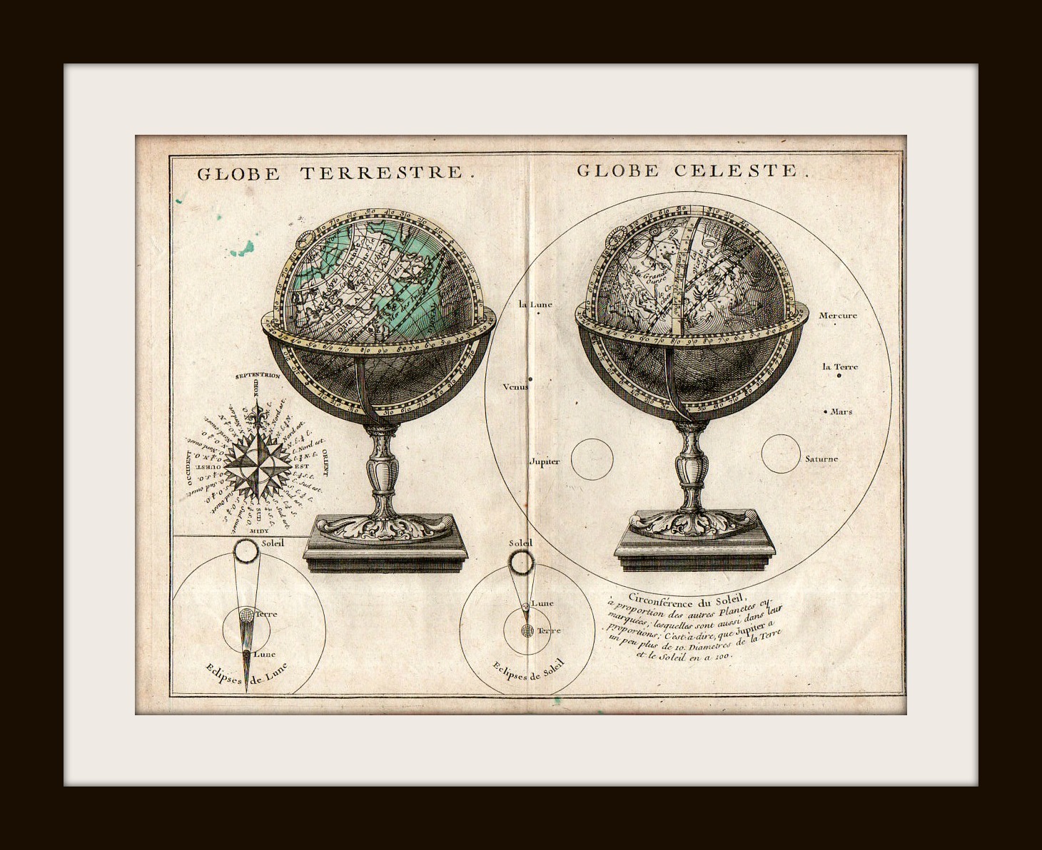 The main object in this engraving--the presentation of two globes, one terrestrial and one celestial--is perhaps less interesting than secondary figures accompanying it. The two small insets of solar and lunar eclipses are instructive and pretty, while the compass rose is full and surprisingly stubby, making that example fairly uncommon--and much more attractive when isolated and cleaned up a bit. So too for the rudimentary but elegant comparison of the sizes of the planets compared to the Sun that surrounds the celestial globe--again, isolated and defined, the image is striking.