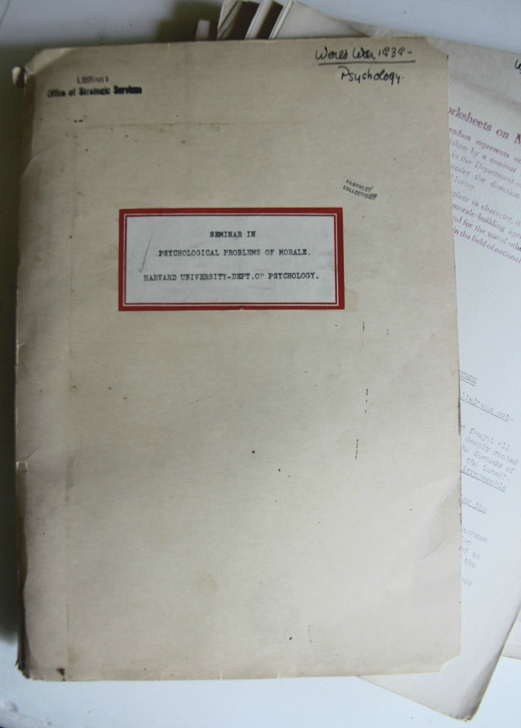 The sections include: (1) Aim of Seminar, 2 lvs; (2) Selected Bibliography, 1941, 3 lvs; (3) Notes on the Definition of Morale, 3+3lvs; (4) Determinants of Good and Bad Morale, 18 lvs; (5) Historical Trends of National Socialist Ideology, 14 lvs; (6) Hitler the Man, Notes for a Case Study, 22 lvs; (7) Education in Nazi Germany, 8 lvs; (9) Strategy and Tactics for anti-Nazi propaganda, 10 lvs; (10) Democratic vs. Totalitarian Morale in Groups, 5 lvs; (11) Standards of Democratic Morale-Building in the U.S., 6 lvs; (12) Civilian Morale Building Techniques, 7pp; (13) Psychology of Influence (Education Persuasion) Applied to Morale Building in America, 16 lvs; (14) Long-term Aspects of Democratic Morale-Building, 7 lvs; (15) Analysis and Execution of Propaganda Campaigns, 18 lvs.