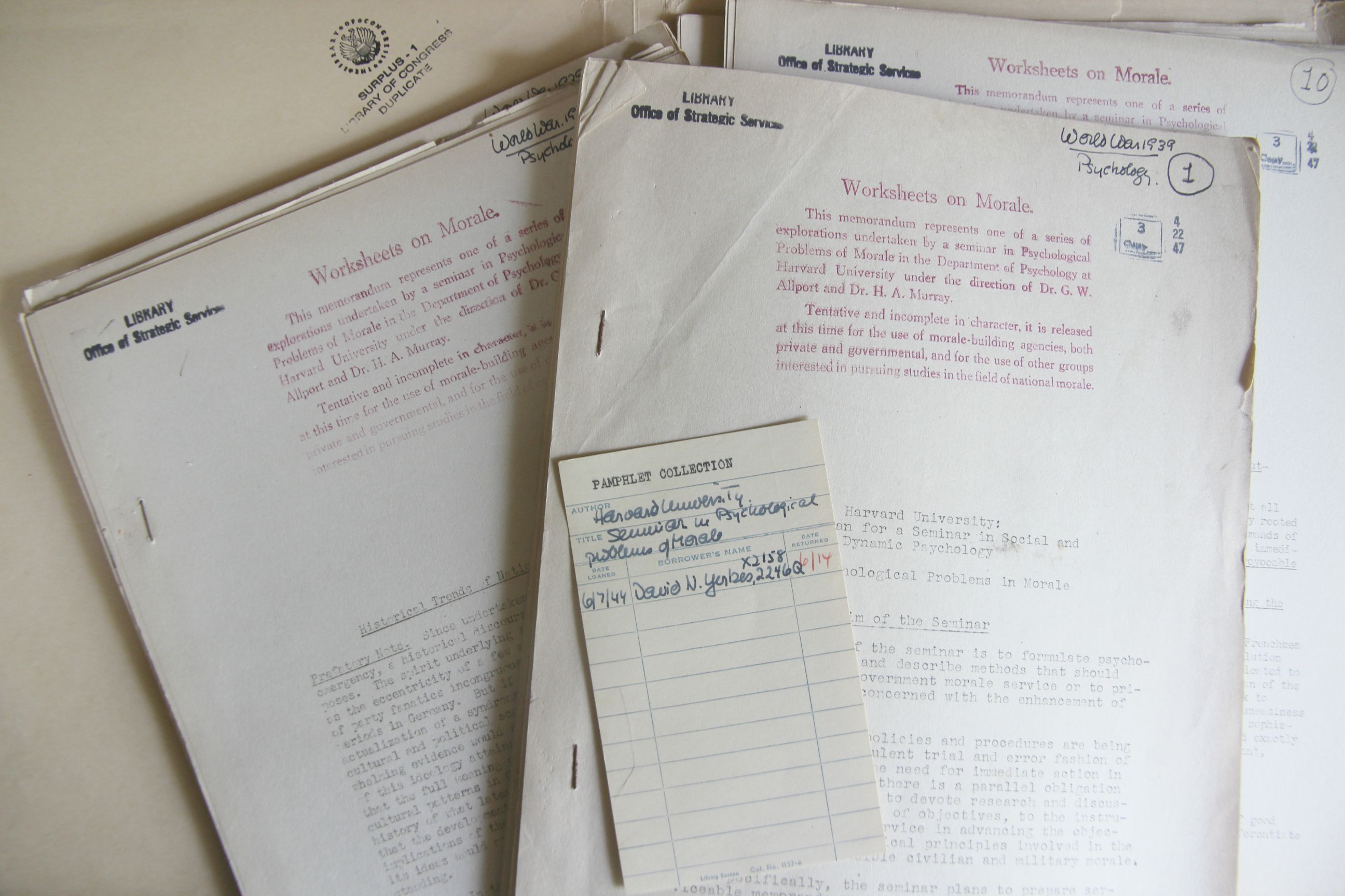 These sheets were obviously not intended for a wide distribution. It is interesting to note the circulation card in the pocket at the rear of this work as it bears the signature of David N. Yerkes. I spoke with Mr. Yerkes back in the late 1990's and inquired after his interest in this work (taken out on 7 June 1944 and returned 14 June 1944), and he told the story that Henry Murray was a pupil of his father's, who was Robert Yerkes, former president of the American Psychological Association, Professor of Psychology at Harvard and innovator in the use of psychological testing and training of American servicemen during WWI. Beyond that he couldn't recall exactly why he had borrowed the report.