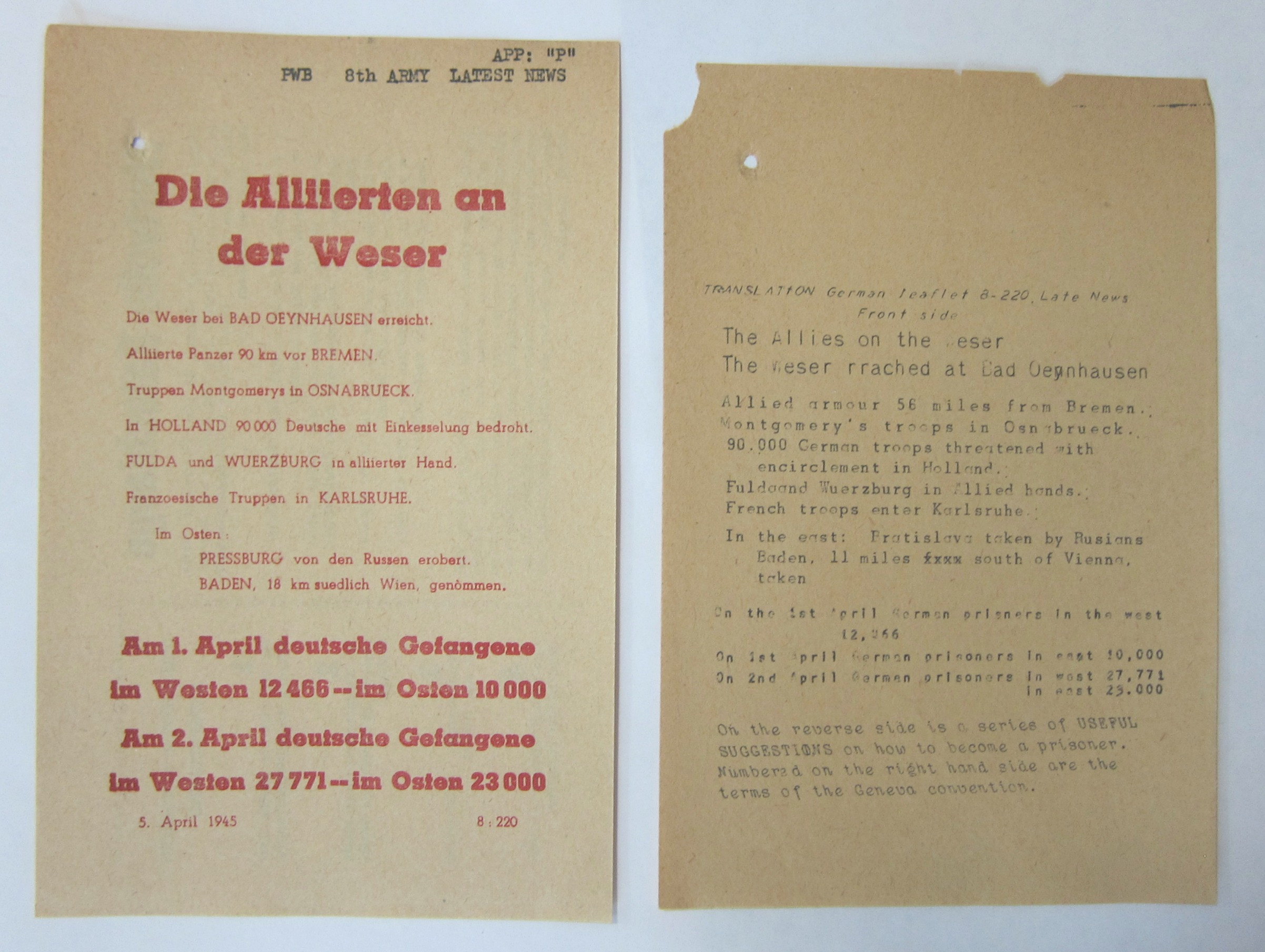 Deutschlands R-Industrie, ins Herz Getroffen—Am 30 Maerz 19 166 deutsche Gefangwene im Westen PWB 8th Army Latest News 2 April 1945 (with separate English translation sheet) |