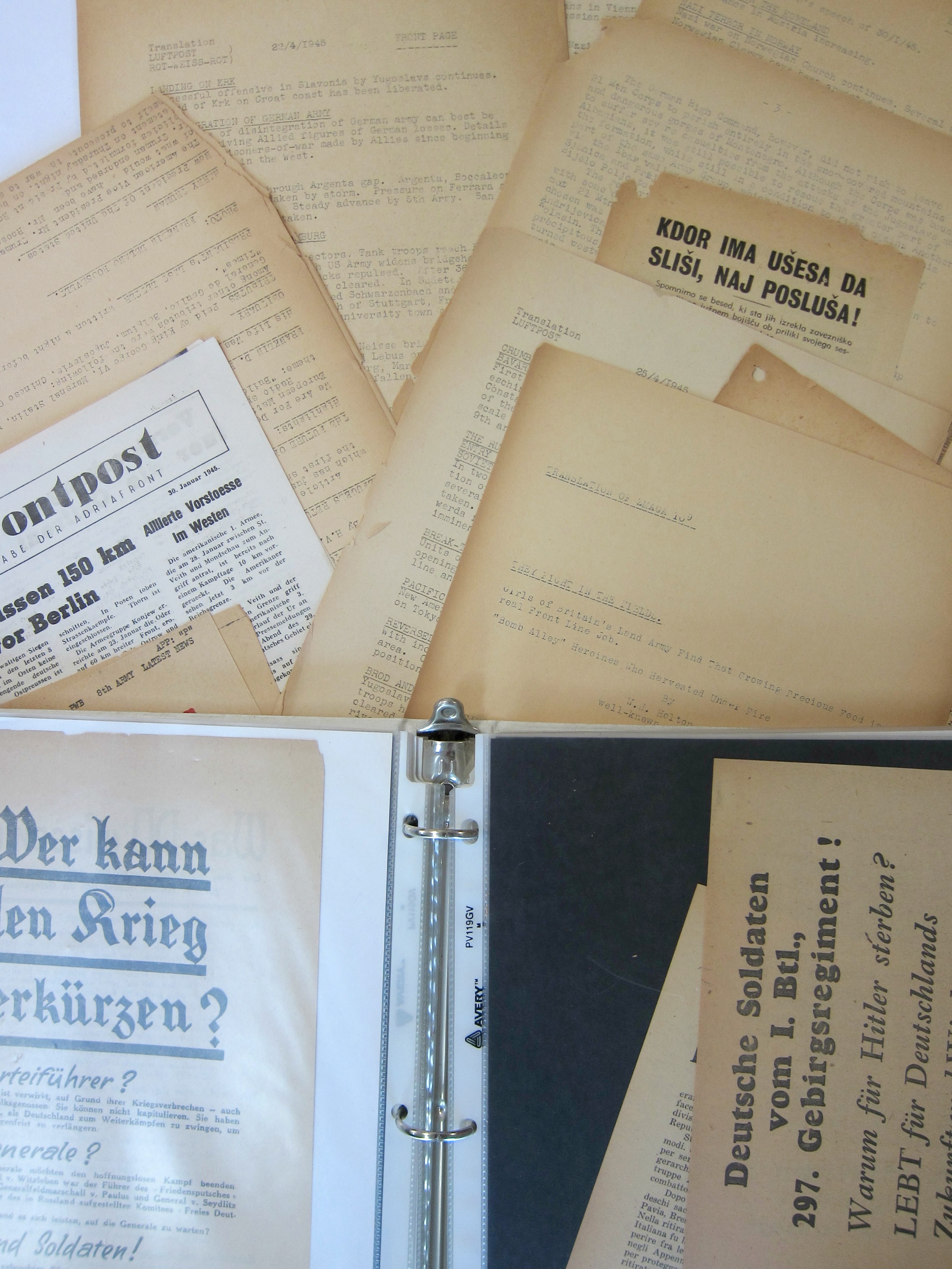 The newspaper-leaflets include Frontpost Ausgabe Sud, Rot Weiss Rot, Soldaten-Nachrichten, Nachrichten auf die Heimat, Luftpost, Poseda, Mundimi, Neuester Nachrichten.