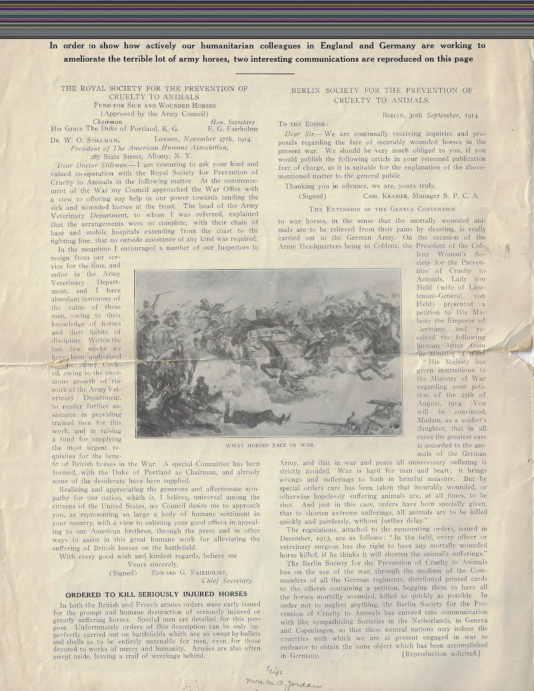 "An Appeal for Help for War Horses". 12x9", 4pp (one large sheet folded). There is a horizontal fold with two long tears in it. Overall, a FAIR copy, maybe a little better than that. $150