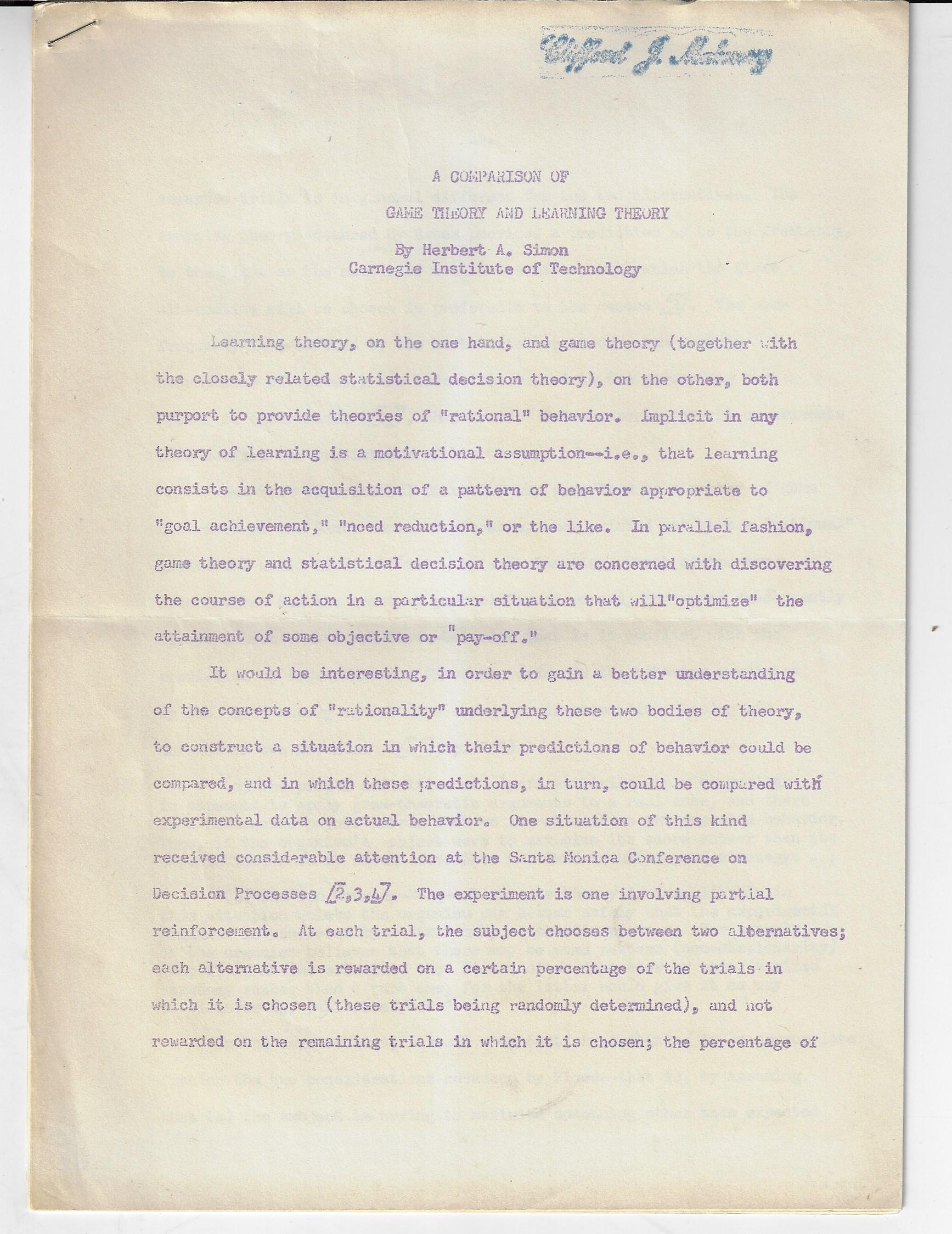 SIMON, Herbert. A Comparison of Game Theory and Learning Theory. Pittsburgh: Carnegie Institute of Technology, (1956). 1st edition. 11x8.5", nine mimeographed typed sheets, staple-bound. Owner's stamp on top front wrapper upper right. Fine copy. Rare.SOLD [This would appear in Psychometrika, vol 213, Sept 1956.]