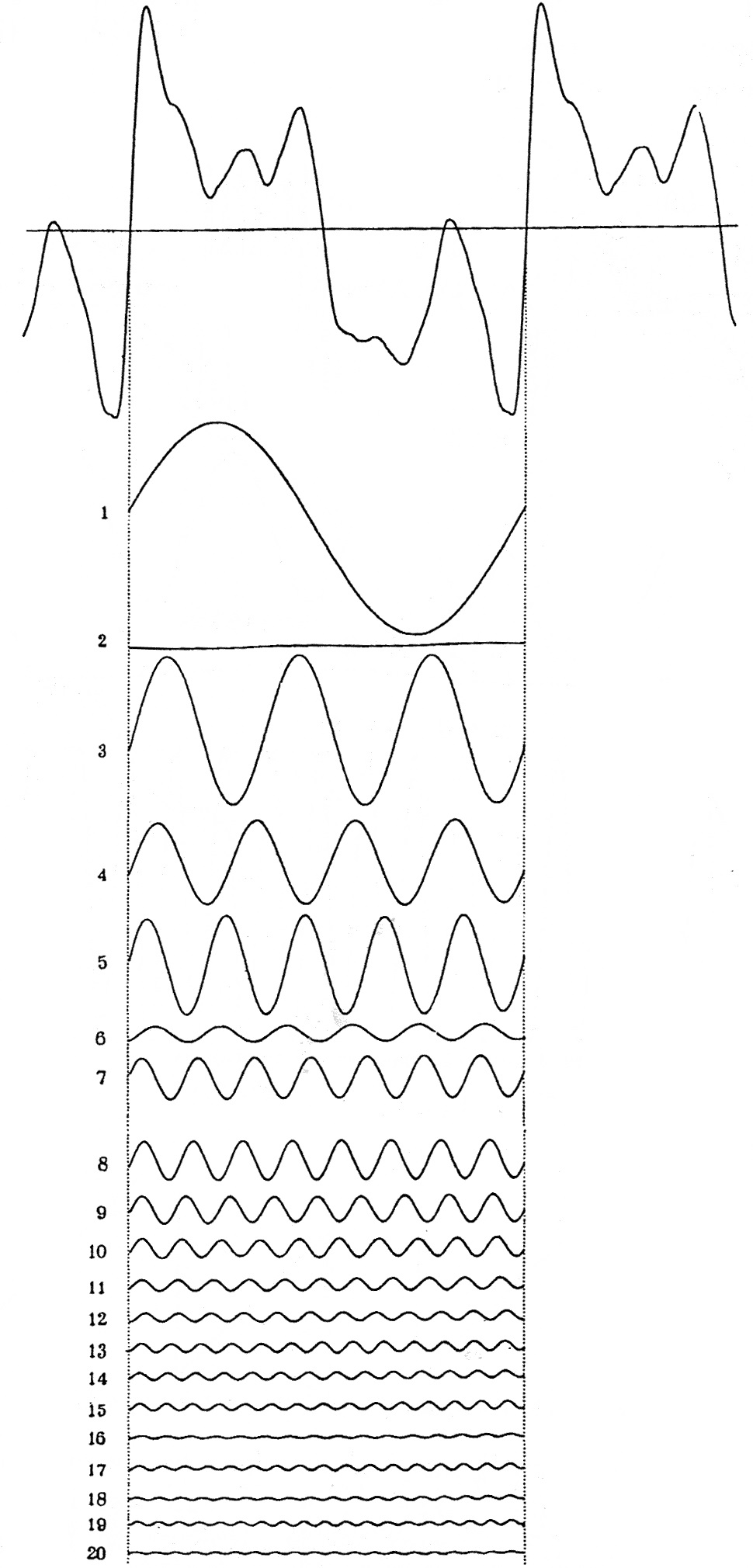 And one of the results as it appeared on page 73 of the Journal of the Franklin Institute, a curve representing the sound wave from a clarinet and twenty of its harmonic components: