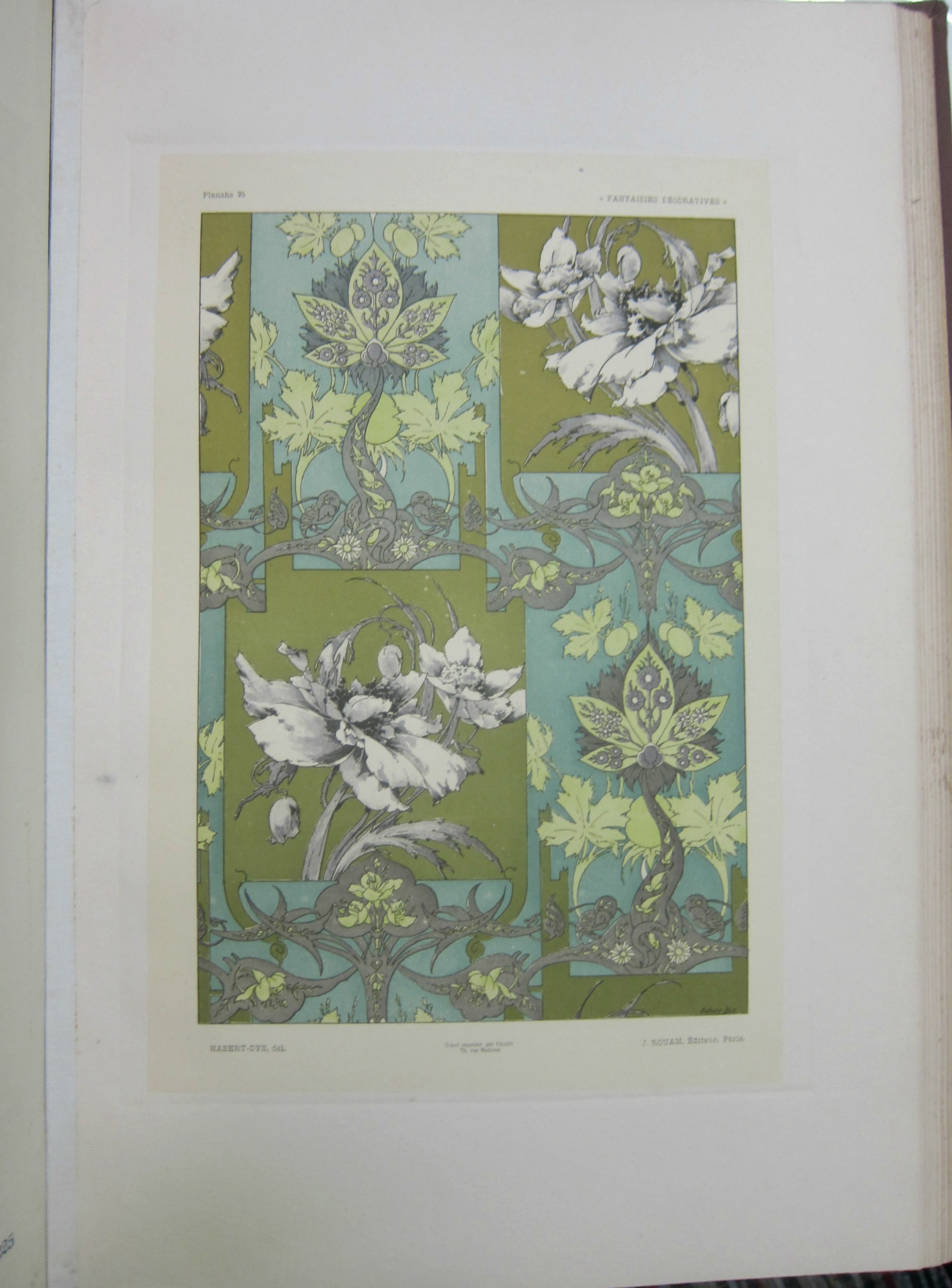 "The intricate patterns, featuring birds, animals, flowers, fish, insects, shellfish, and frogs, were designed for ceramics, plates and dishes, textiles, wallpaper, vases, and jewelry. In these exquisite creations, Habert-Dys adopted many elements of Japanese influence (Japonisme), which reflect the late nineteenth century’s fascination with Japanese art. The Fantasies Decoratives also contain elements of line and curve that later became an intrinsic characteristic of the next major movement in the art world, Art Nouveau."