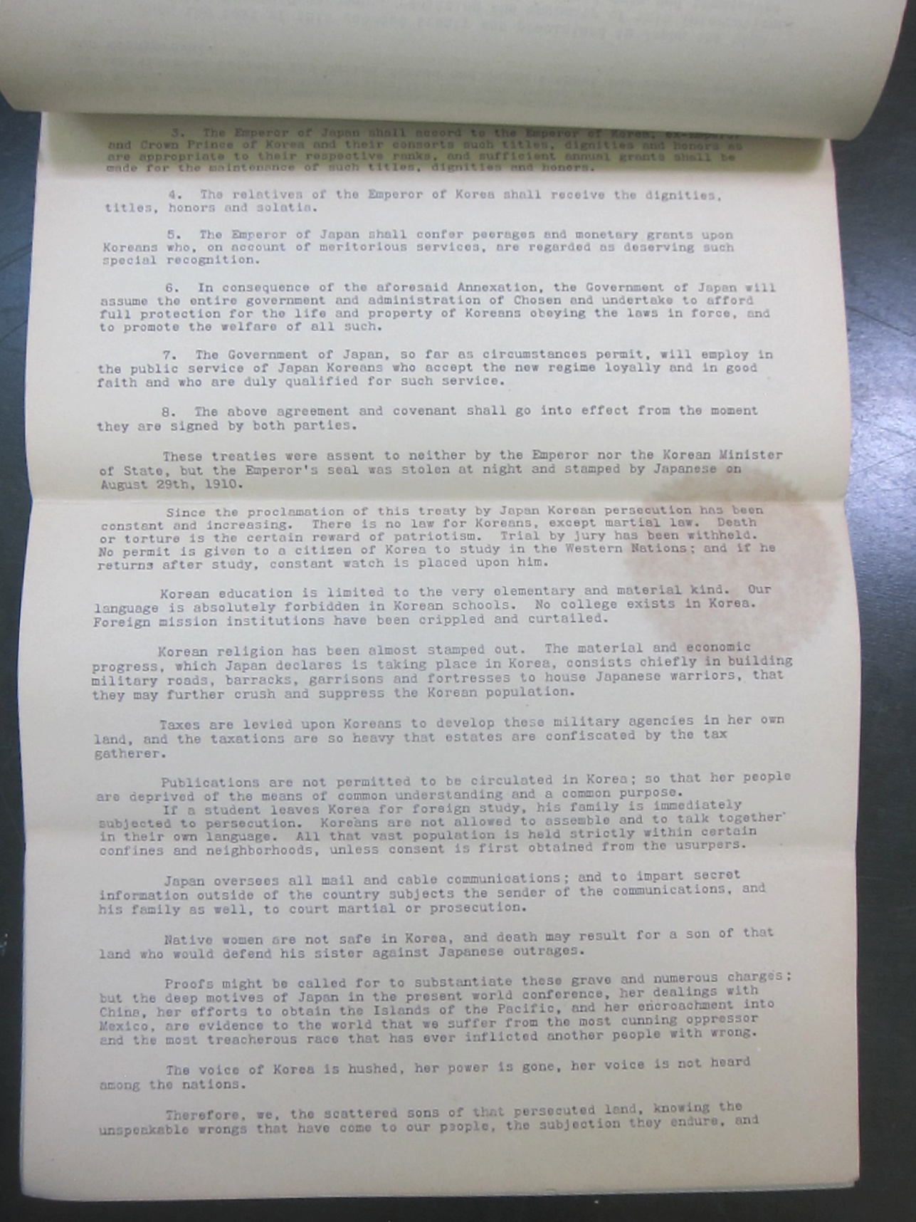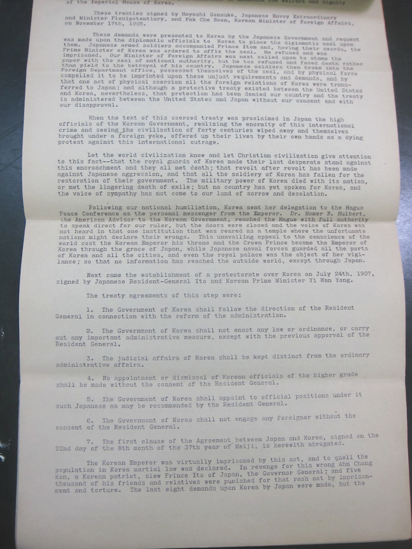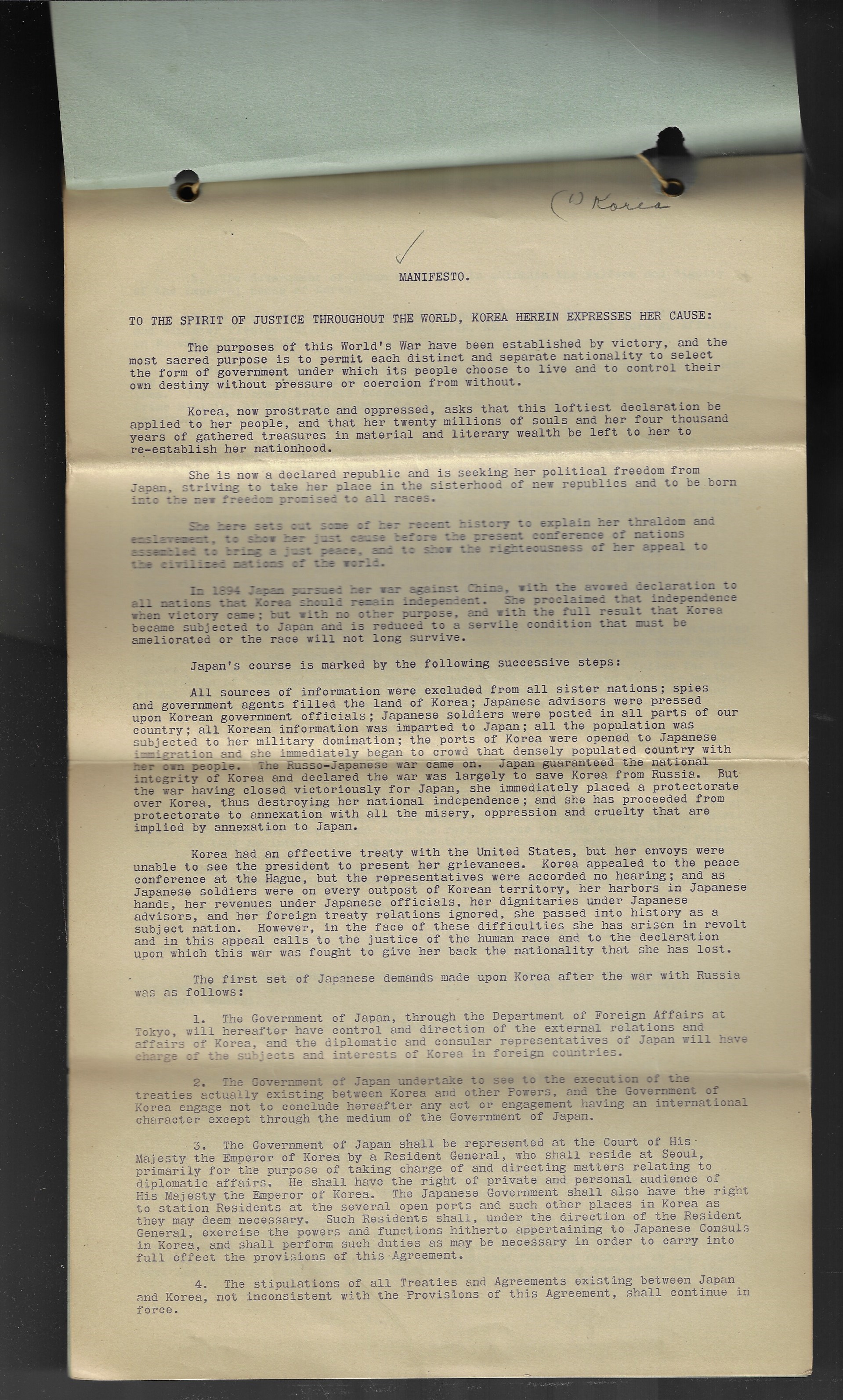 “Korea, now prostrate and oppressed...(should) be left to re-establish her nationhood. She is now a declared republic and is seeking her political freedom from Japan...(and to be released from “enslavement”). It is all pretty strong language, nestled even as it is in halting official discourse in its plea to member nations of Conference.