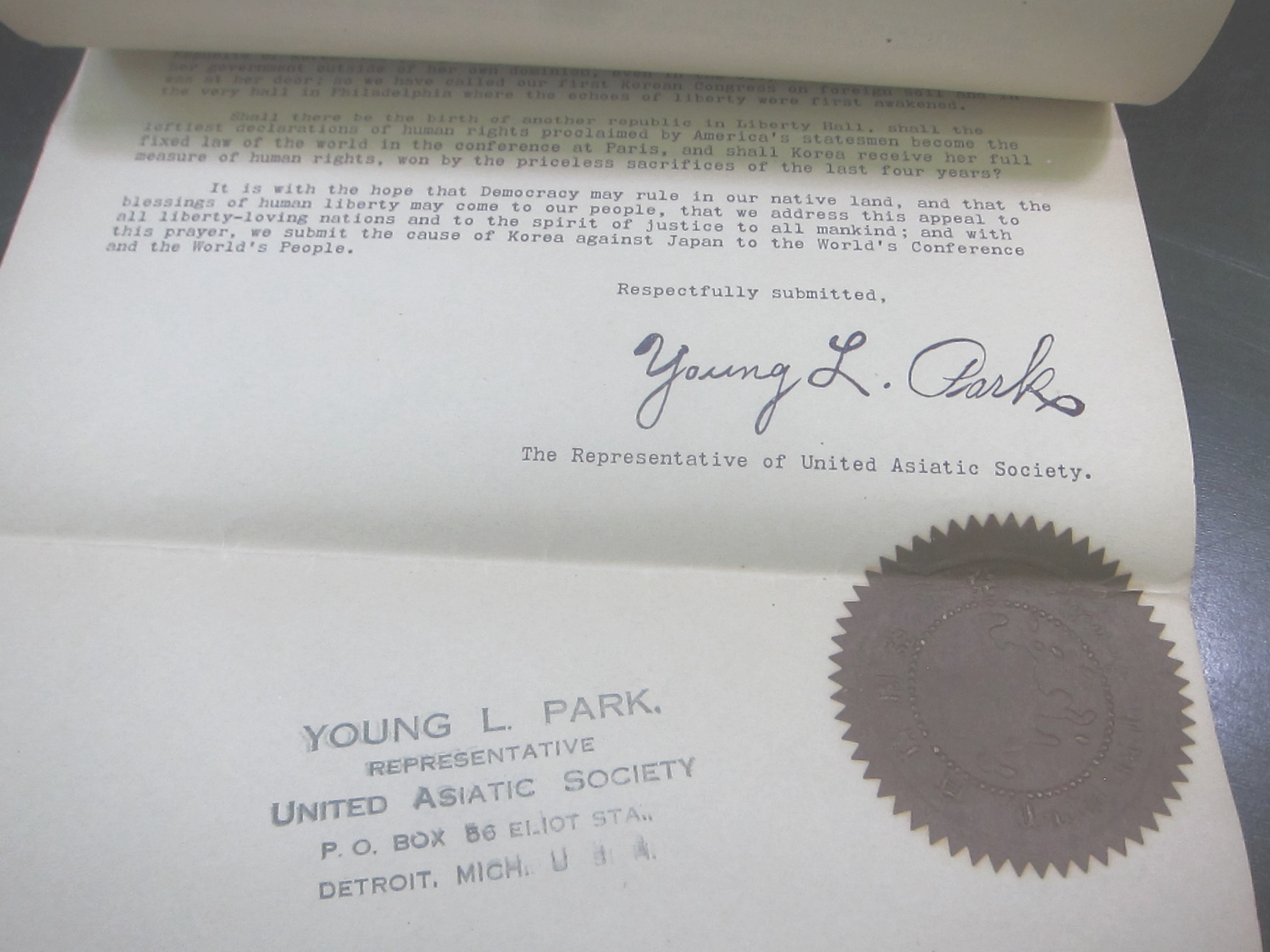 This is a strong argument from Young L. Park (of the United Asiatic Society, of Detroit), addressing members to the Paris Peace Conference (also known as the Versailles Conference, 1919-1920) in which he wrote on the inequality and oppressive nature of Japanese expansion into and control of Korea, and that the outcome of redistribution of former colonial territories following WWI should include the liberation of Korea. But Park and Korea would soon learn that those discussions were limited to colonies of Europeans defeated in the war, and the issue of Korea would not be of concern at the conference. (For example the conference would create the British Mandate of Palestine and in the creation of Iraq, Syria, Lebanon and Jordan as nation states.)
