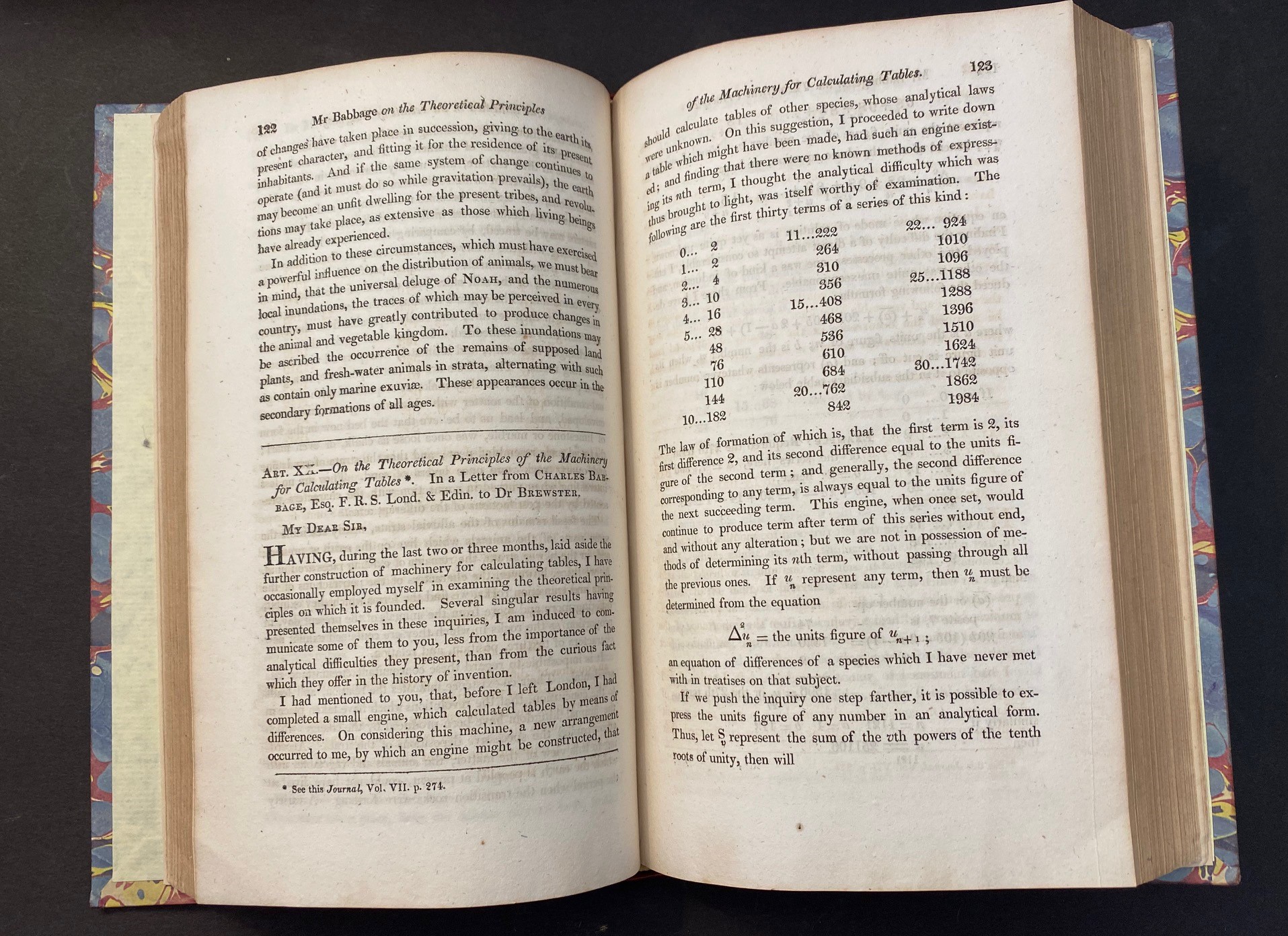 BABBAGE, Charles. "On the Theoretical Principles of the Machinery for Calculating Tables. In a letter from Charles Babbage. Esq. F.R.S. Lond. & Edin. To Dr. Brewster". In the Edinburgh Philosophical Journal, October 1, 1822 to April 1, 1823, volume VIII. Edinburgh, printed for Archibald Constable and Co. 1823. The Babbage occupies pp 122-128 in the volume of iv,iv,428pp, with 7 plates (one folding). Newly rebound in half-calf and marbled boards, with gilt decorated raised bands, new (heavy) endpapers—a lovely job by the binder. The text is clean and fresh, and the binding is new. FINE copy. $750