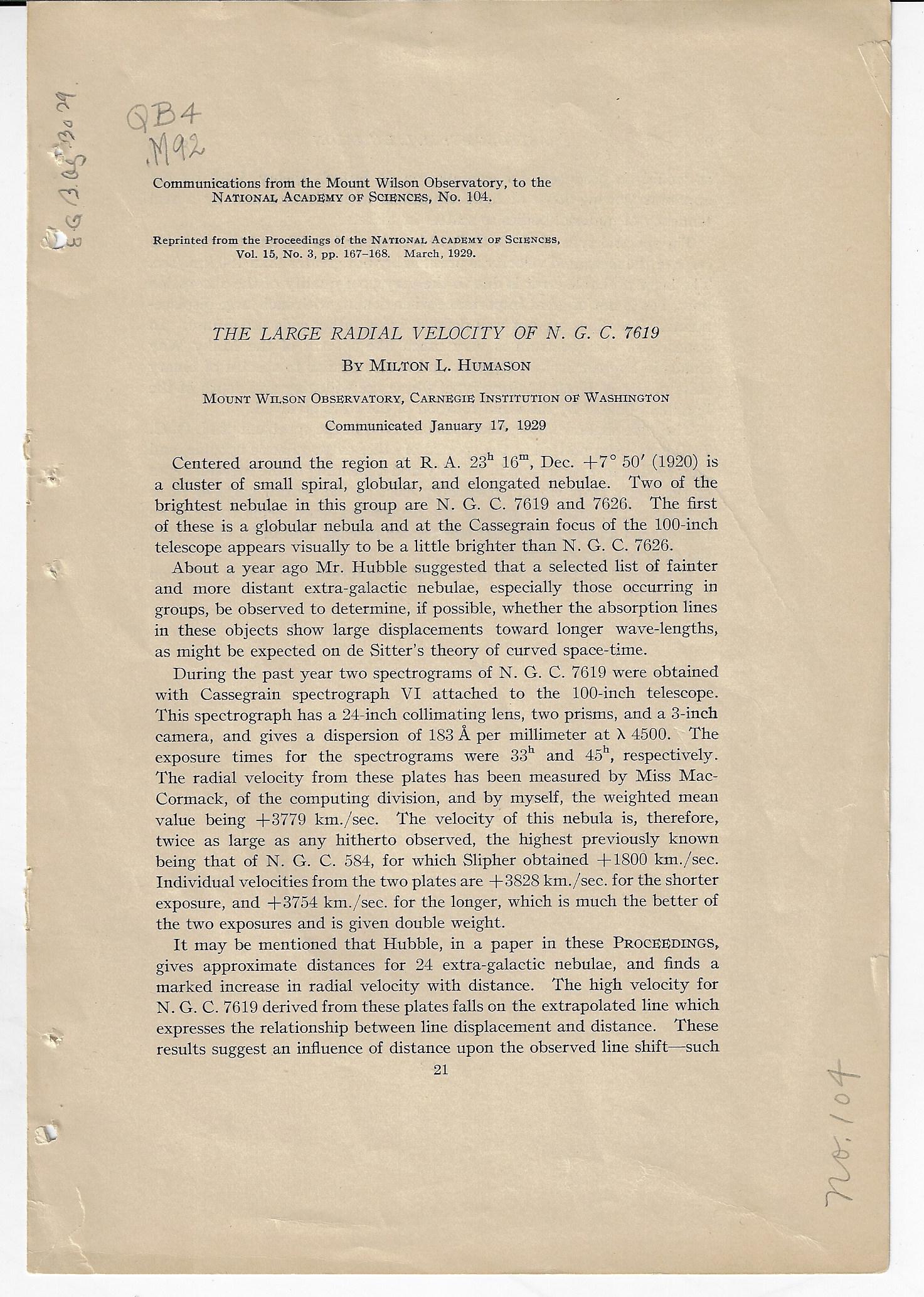 “In this paper Hubble added two additional groups of nebular counts to the three groups already discussed in his 1935 paper with Tolman. After a detailed analysis of the observational data, and a comparison with the theoretical models computed with Tolman, Hubble found that "the observations may be fitted into either of two quite different types of universes. If the red-shifts are velocity shifts, the model is closed, small and dense. It is rapidly expanding, but over a long period the rate of expansion has been steadily diminishing. Existing instruments range through a large fraction of the entire volume and, perhaps, through a considerable fraction of past time since the expansion began. "On the other hand, if red-shifts are not primarily due to velocity shifts, the Observable Region loses much of its significance. The velocity-distance relation is linear; the distribution of nebulae is uniform; there is no evidence of expansion, no trace of curvature, no restriction to the time scale. The sample, it seems, is too small to indicate the particular type of universe we inhabit.”--National Academy of Sciences, Biographical Memoirs, 1970