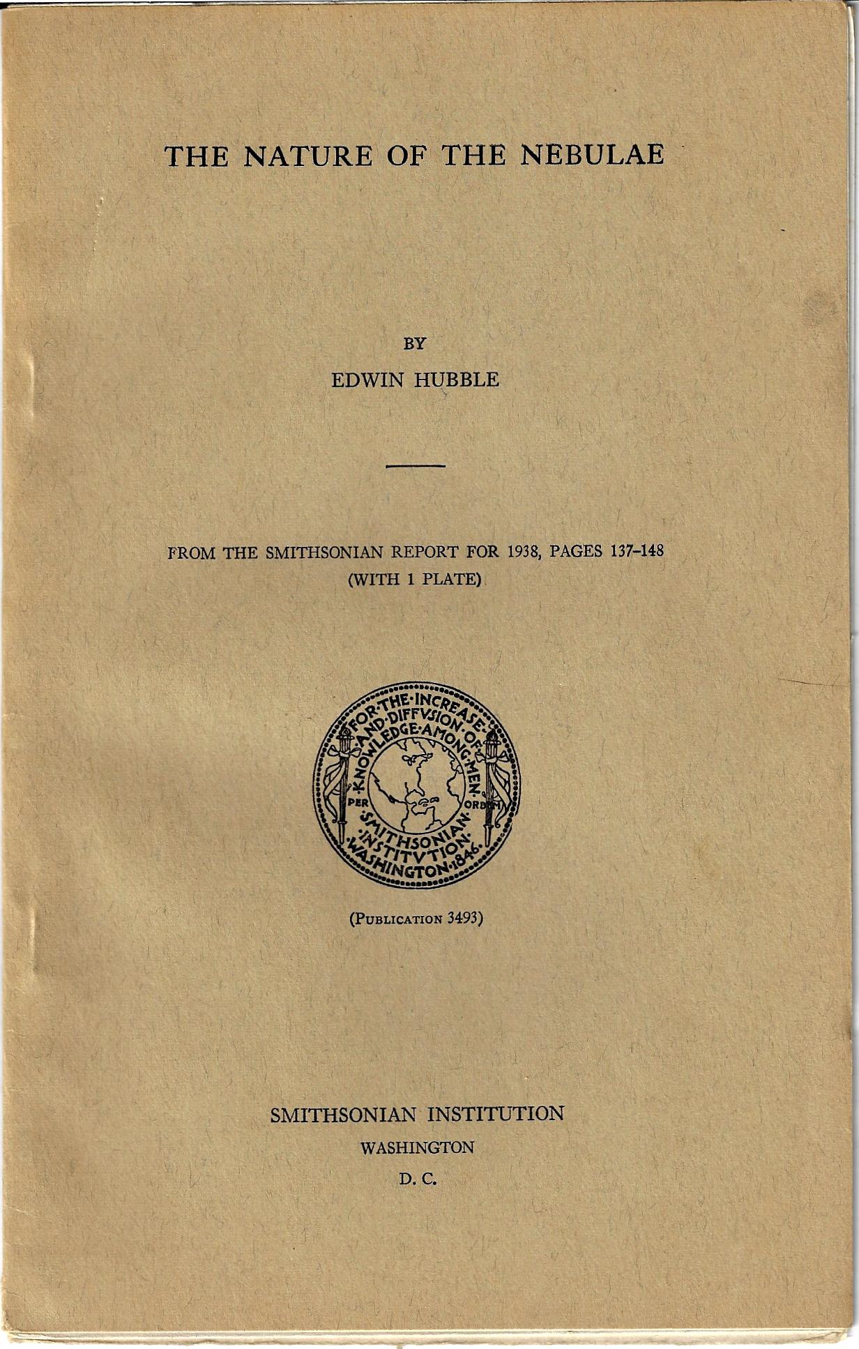 Edwin Hubble, "The Nature of the Nebulae", offprint from the Smithsonian Report for 1938, pages 137-148, with one plate), publication 3493. Published by the Smithsonian Institution in Washington, D.C., 1939. 24cm.
