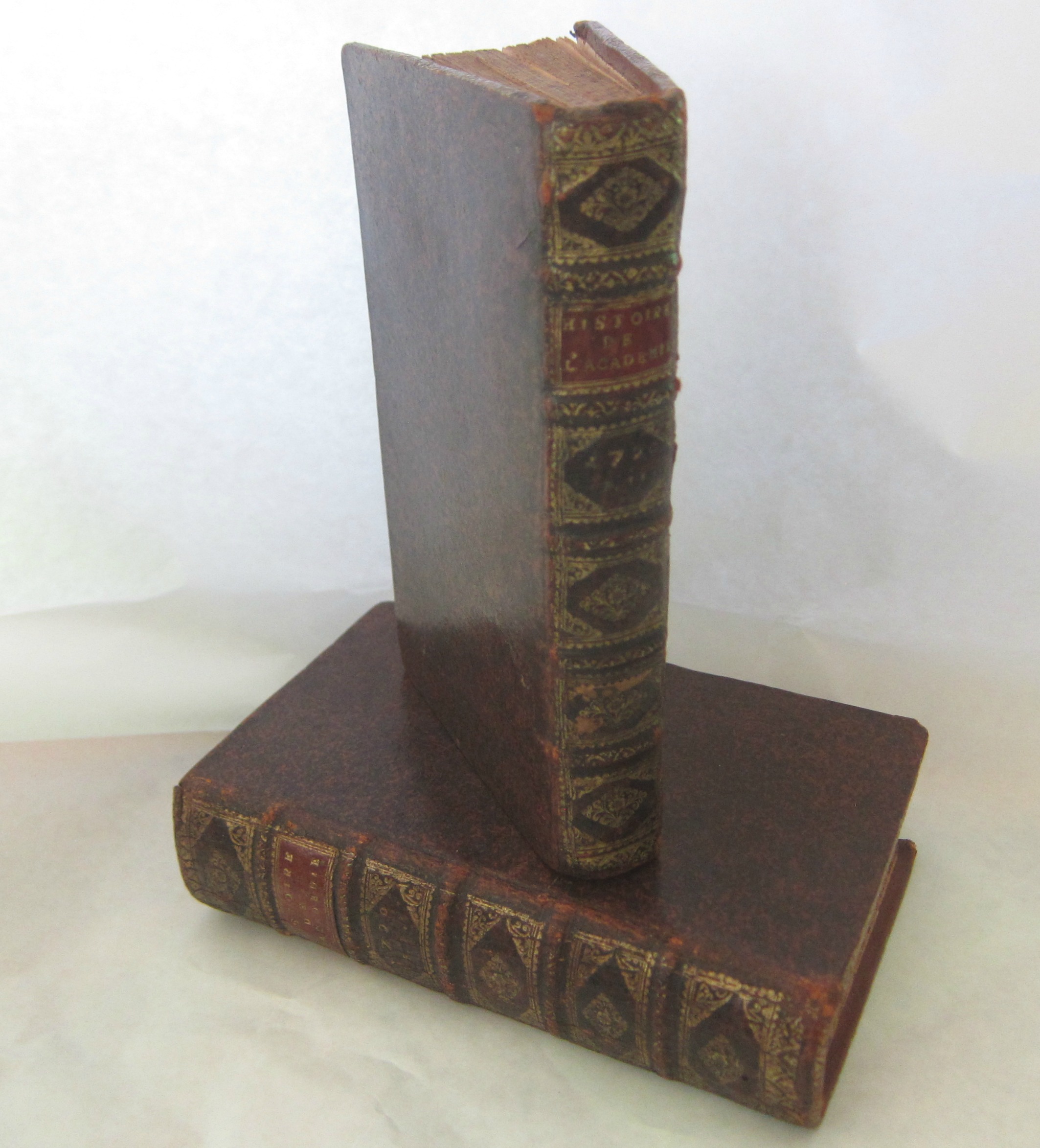 Histoire de l'Academie Royale des Sciences, Annee MDDCXX, avec les Memoires de Mathematique et de Physique pour la meme Annee, Tirez des Registres de cette Academie. Amsterdam, Pierre de Coup, 1724. Two volumes, volume I: (viii), 175, 354pp, plates 1-8; volume II pp 357-604, plates 9-15. 16.5x9.5cm. Very nicely bound in full leather, with decorated six decorated spine panels.