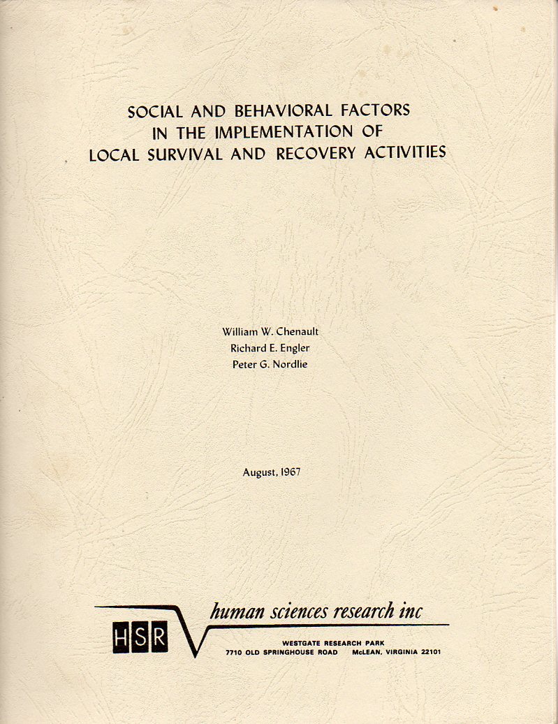 Social and Behavioral Factors in the Implementation of Local Survival and Recovery Activities (written by William Chenault, Richard Engler and Peter G. Nordhie in August 1967. Published by Human Sciences Research, Inc., of McLean,Virginia. 11x8 87pp+xiipp+3pp. Fine condition. WorldCat/OCLC locate 5 copies $350