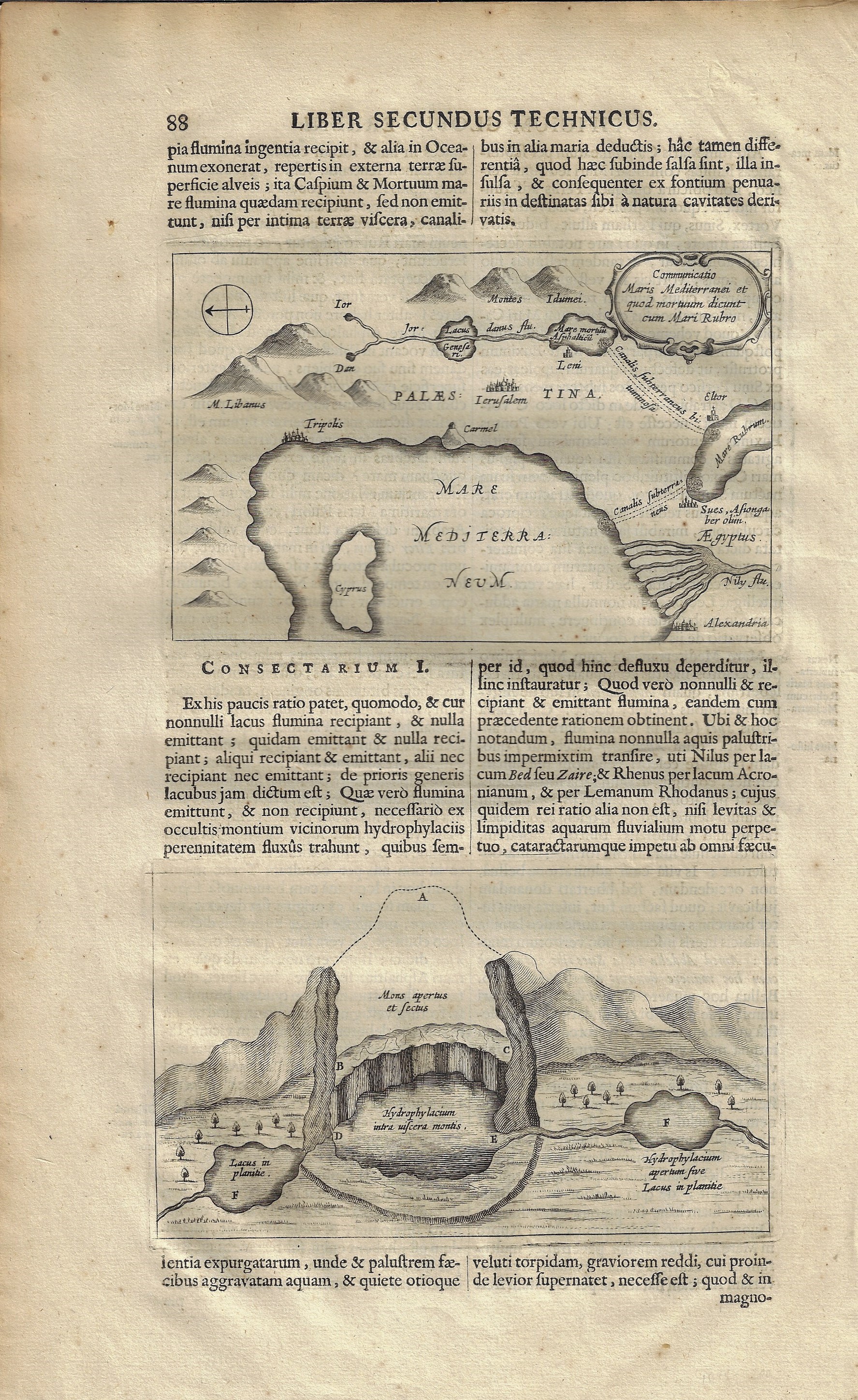 KIRCHER, Athanasius. "Typus Hydrophylacy intra Alpes Rheticas, quod Fundit totius Europae Celeberrima Flumina uti patet”, being a map salvaged from a beyond-repair copy of the great Mundus Subterraneus, ("Athanasii Kircheri Mundus subterraneus in XII libros digestus... "), 1678, from the second section “Officium Globi Terreni”, p. 71; 6”x 8” on a 15”x 9” sheet. Very Good condition. $175