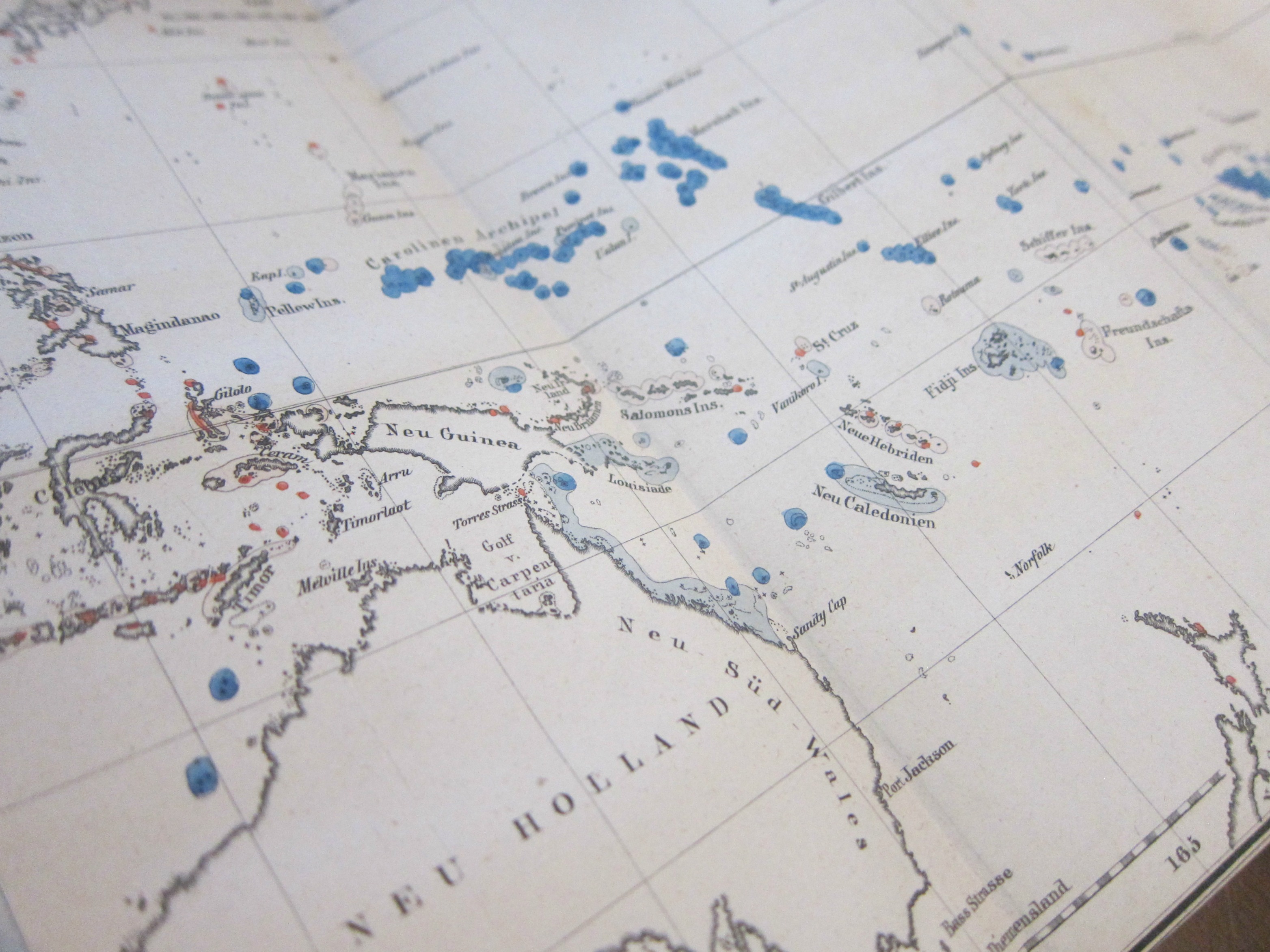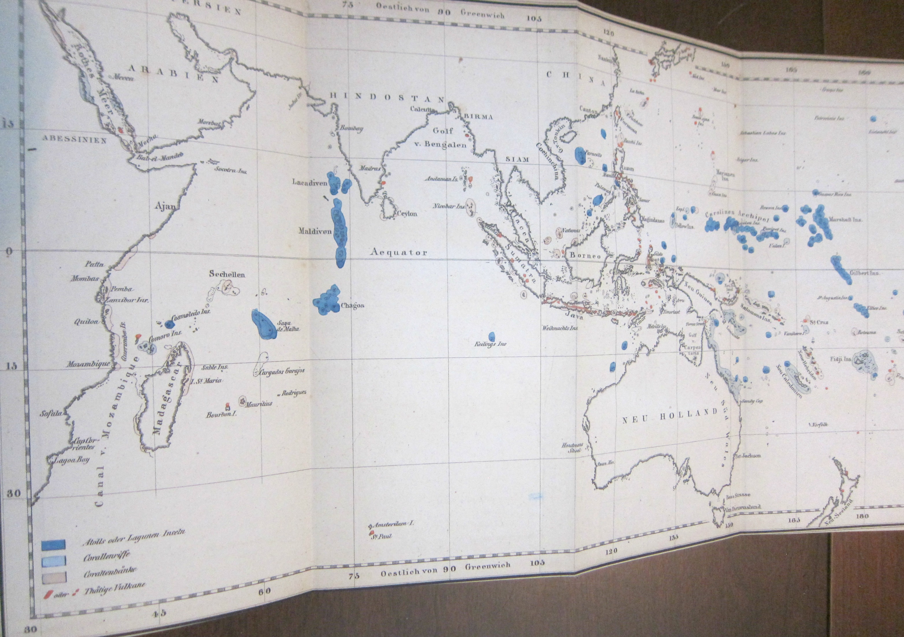 The original map is titled "Plate 3--Shewing the Distribution of the Different Kinds of Coral Reefs, together with the Position of Active Volcanoes in the Map" and was engraved by J. & C Walker, and printed by Smith & Elder. The Annalen map measures 19x28cm and has no title or indication of engraver.