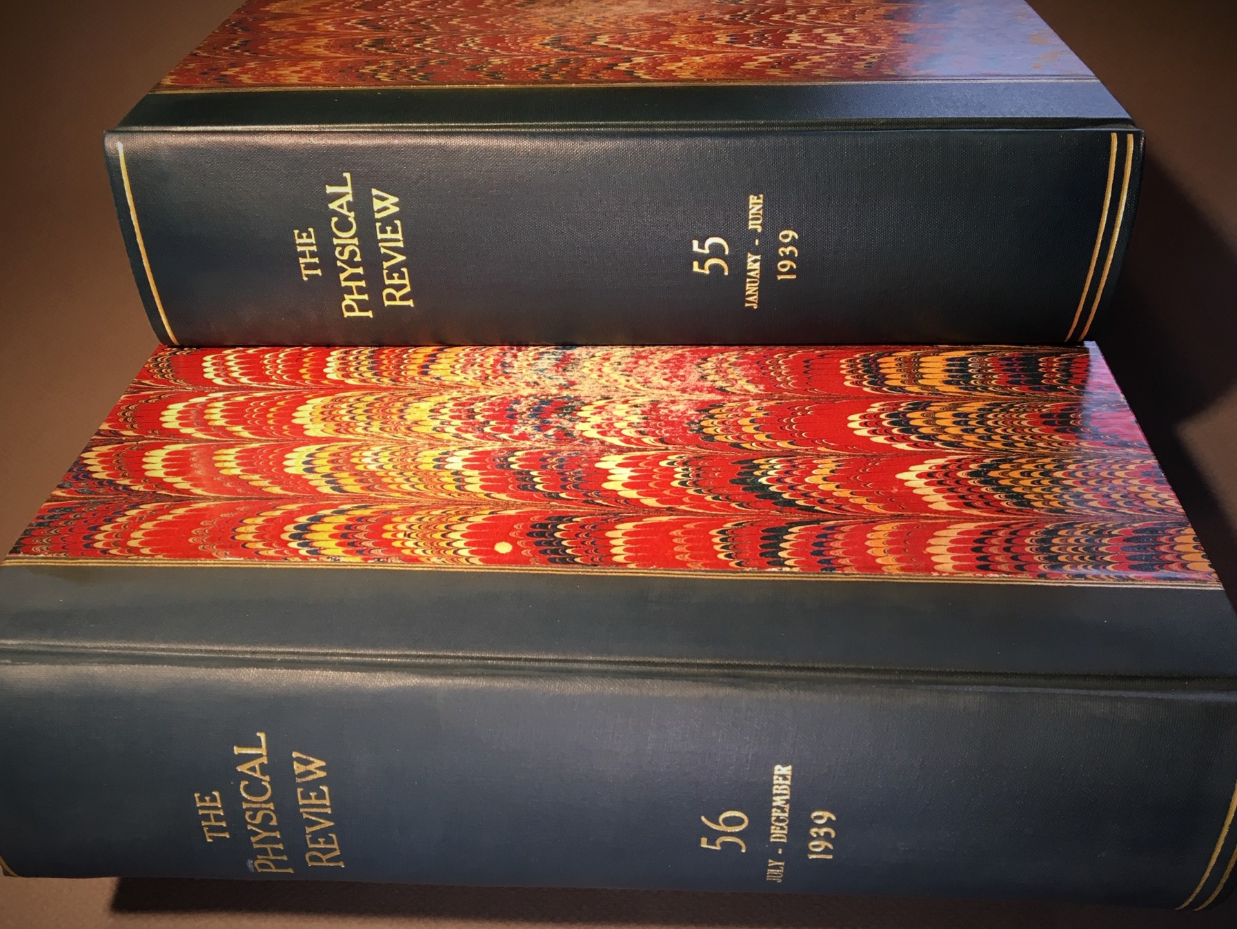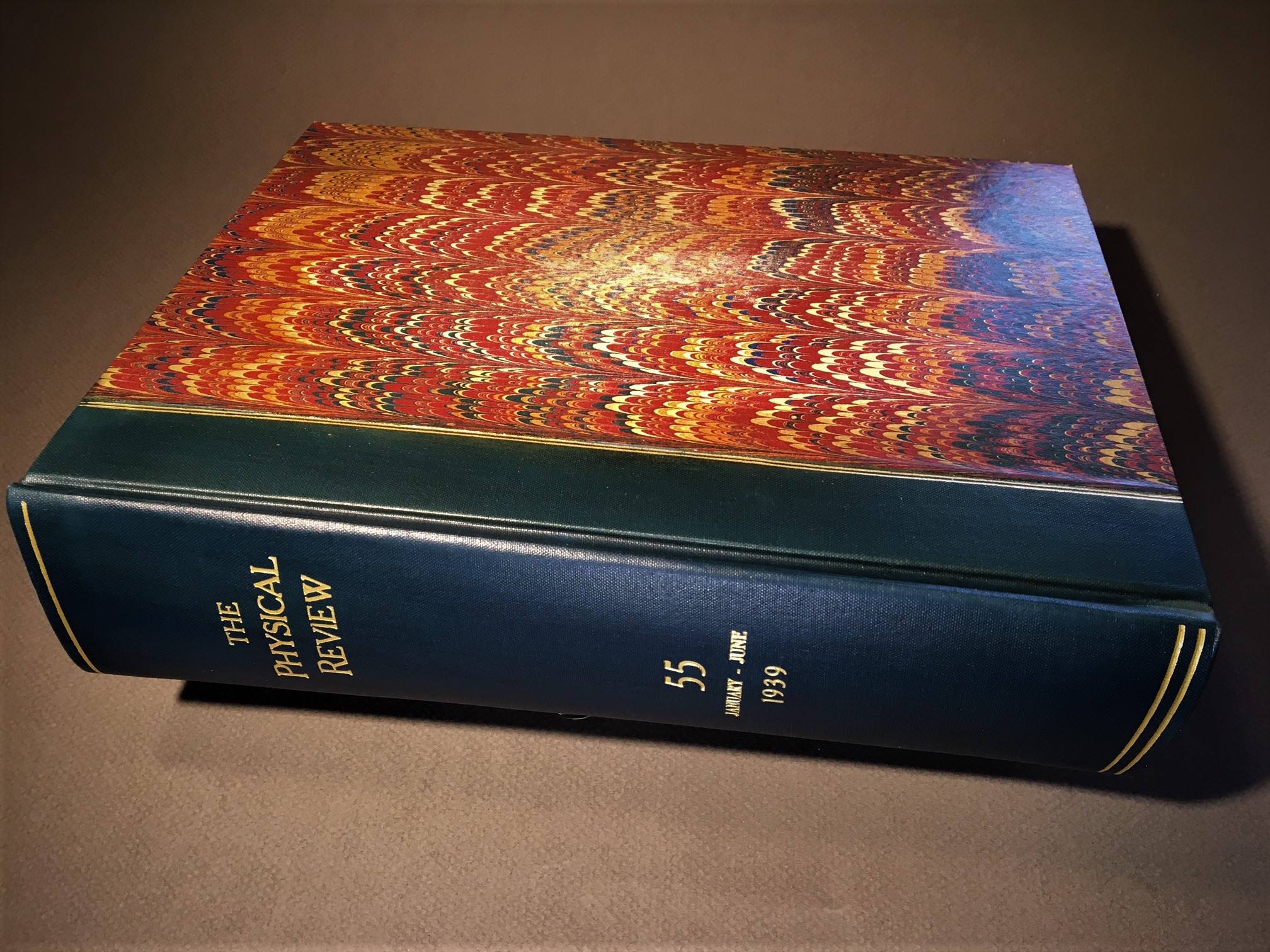 American Physical Society, Lancaster Pa., January-December 1939. Two volumes: x, 1294pp & x,1300pp. The two volumes, complete. Finely and sturdily rebound in cloth and marbled boards. Very stout, readable volumes. Fine condition. Few scant ownership stamps on some of the individual issues' first page. $2250