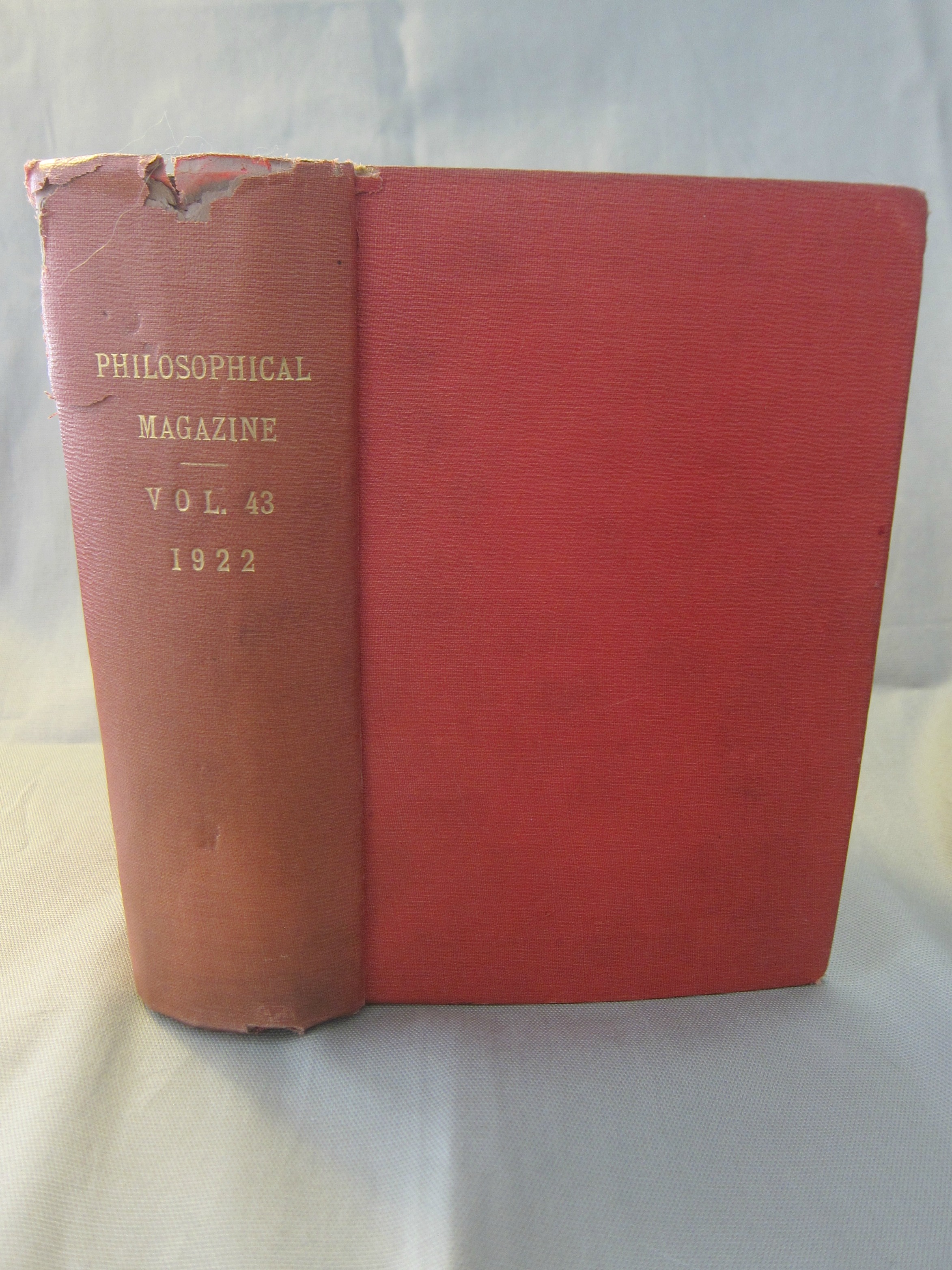The London, Edinburgh, and Dublin Philosophical Magazine; London, Taylor & Francis, Volume XIX, Sixth Series, 1910, viii, 1016, 20 plates, most folding. Heavy buckram binding, with reinforced hinges, making this brick-of-a-book and very readable thing. Red leather spine label. This is "ex-library", though the only evidence of that is a card pocket on the front free endpaper, c'est tout. $350