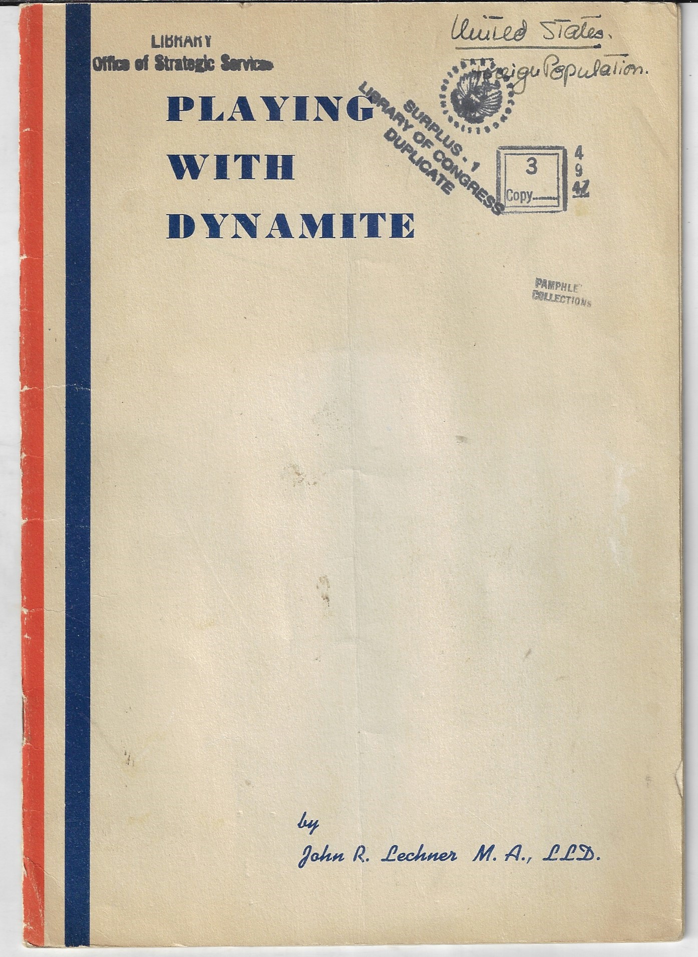 Lechner1, John R. The Inside Story of our Domestic Japanese Problem. (1944) American Legion of California. 10”x 7”, 18pp. Provenance: Kilsoo K. Haan2, to Phillip H. Cummings, who gave this to the Library of the Office of Strategic Services (OSS, precursor of the CIA), and from there to the Library of Congress. Rubber stamps for the OSS library and for the Library of Congress.