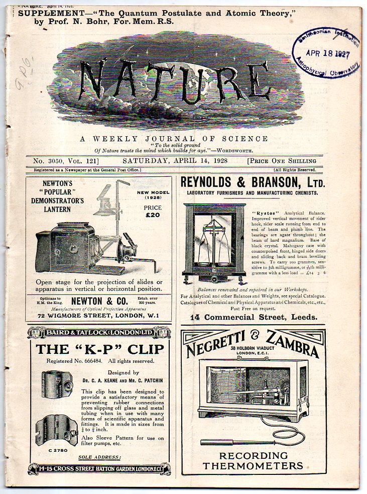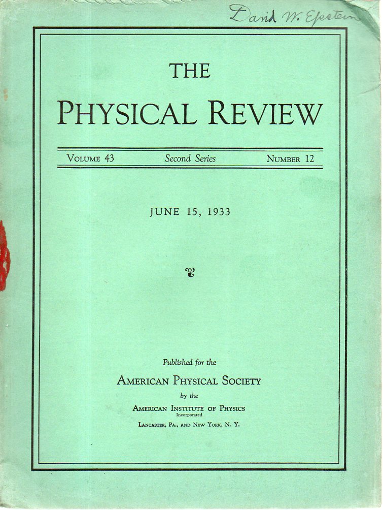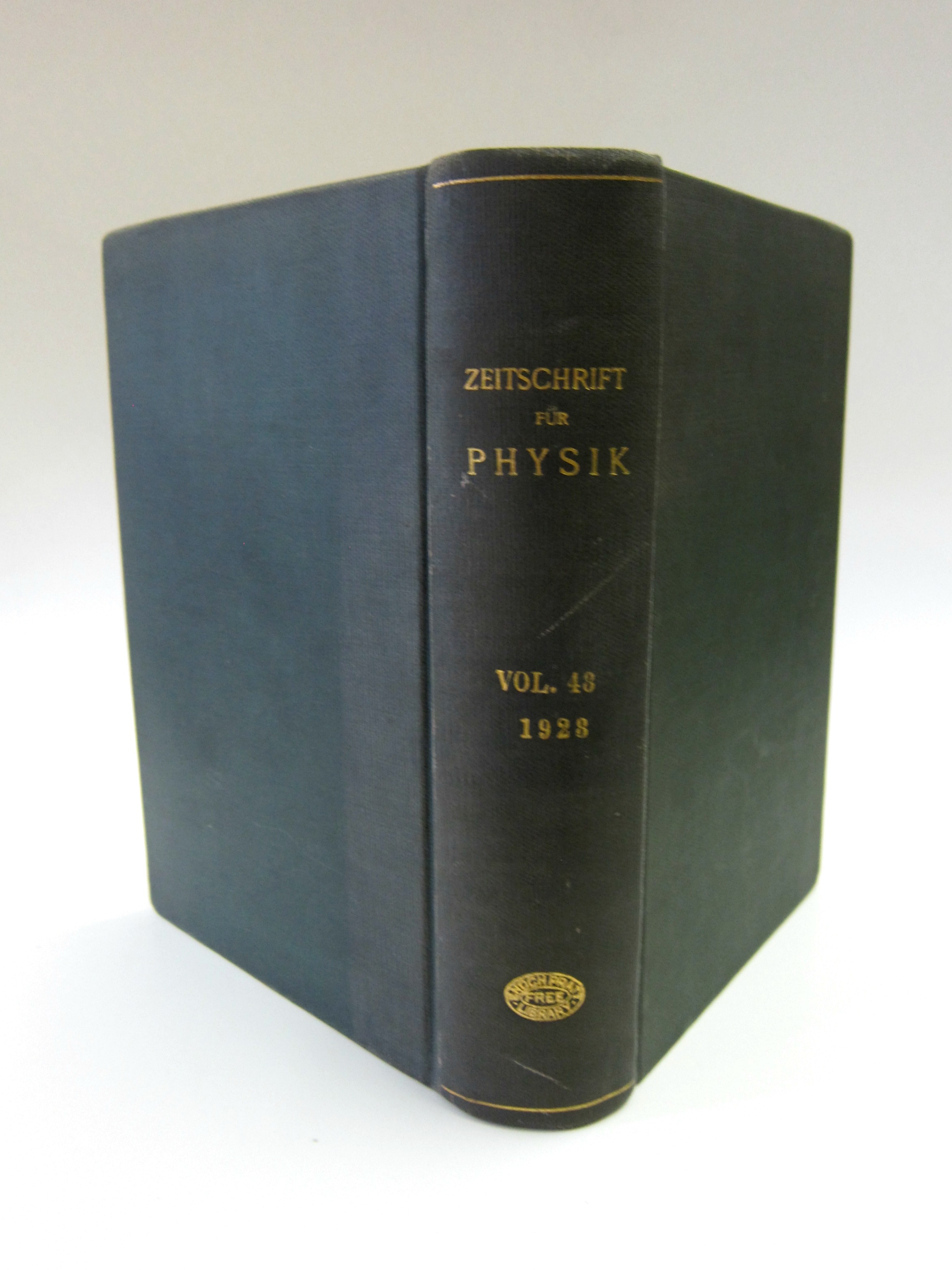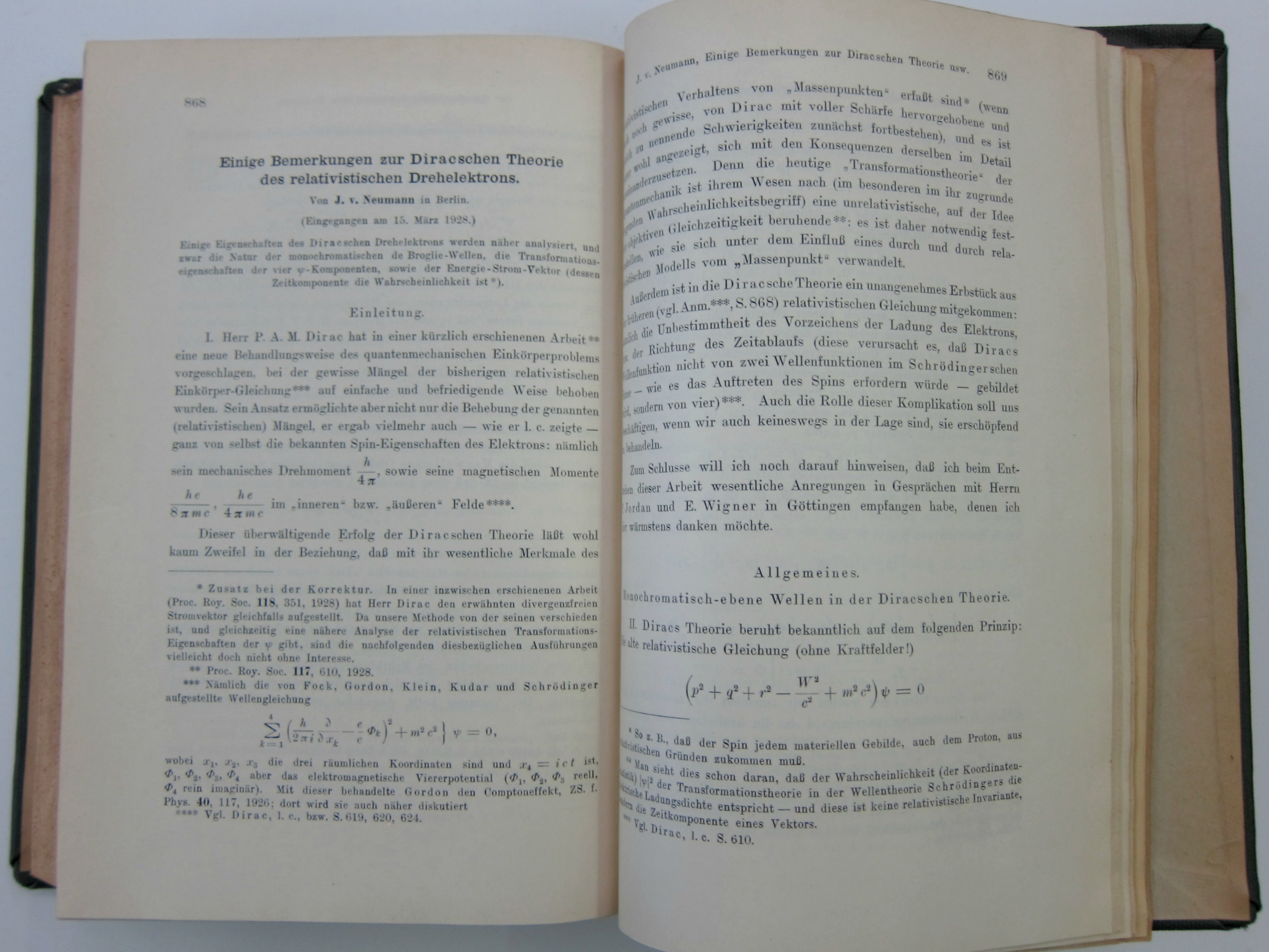 von NEUMANN, John. "Einige Bemerkungen zur Diracschen Theorie des relativistischen Drehelektrons", in Zeitschrift fuer Physik, volume 48, 1928, pp 868-881, offered in the original volume of pp 891. The von Neumann section, band 11/12 for the year, comes with the original wrappers, bound in at the end. Cloth binding, small institutional gilt-stamped library slug at spine bottom, along with bookplate, and half-faded rubber stamps on the wrapper cover and on the title page. Still, a nice, free copy. $350