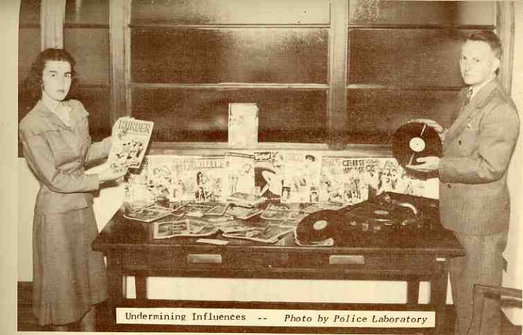 Only 62 years ago the basic contributors to the delinquency of American youth were recklessness, idleness, books and records, and this helpful pamphlet, Delinquency Prevention, the City's Future, published unattributed in 1947 for the Youth Protection and Delinquency Prevention Program for the city of San Diego, California, had many of the basic answers to the knotty questions of raising good-spirited anti-corrupt young folks. This young woman, appearing on page 27 in the photo captioned "Undermining Influences--photo from Police Laboratory" stood before a neatly laid table packed with expediencies of social decay, and from the looks of it, she could barely stand to be there, even though she was protected by a mighty and invisible cloak of superiority. (It seems that she is caught in mid-sentence, gingerly holding her MURDER magazine, jaw thrust forward, fixing the camera with a sharp left eye which was fortressed by a mighty and disproportionately-sized eyebrow.)