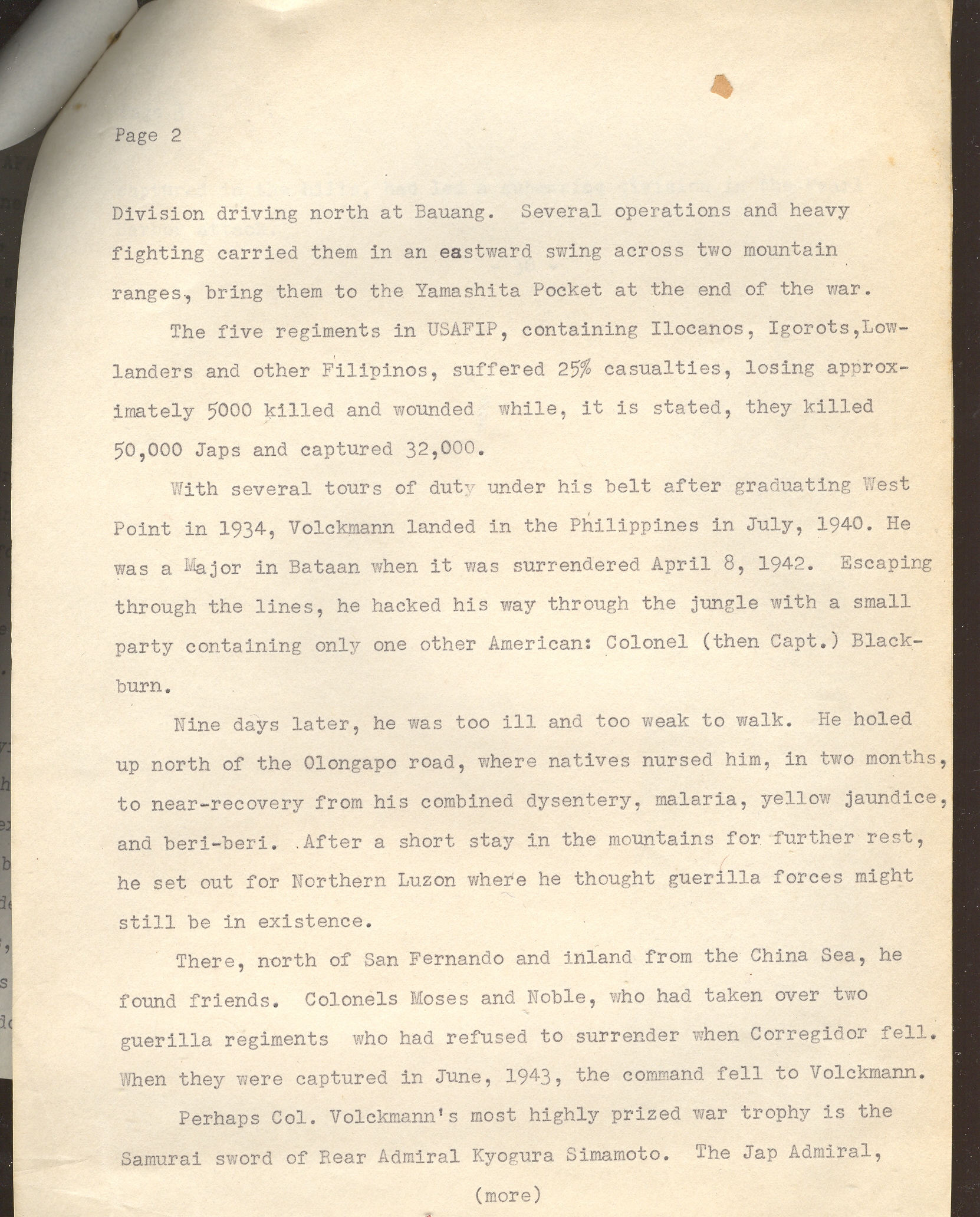 The first document relates the extraordinary story of Col. Russell W. Volckmann who from 1942 led a force of thousands of guerrillas against the Japanese and who, by September 1945, led a force of 20,000 in routing the last elements of the Japanese army. (The entire text of his memoir written in 1954 as We Remained Behind: Three Years Behind the Enemy Lines in the Philippines can be found here.)