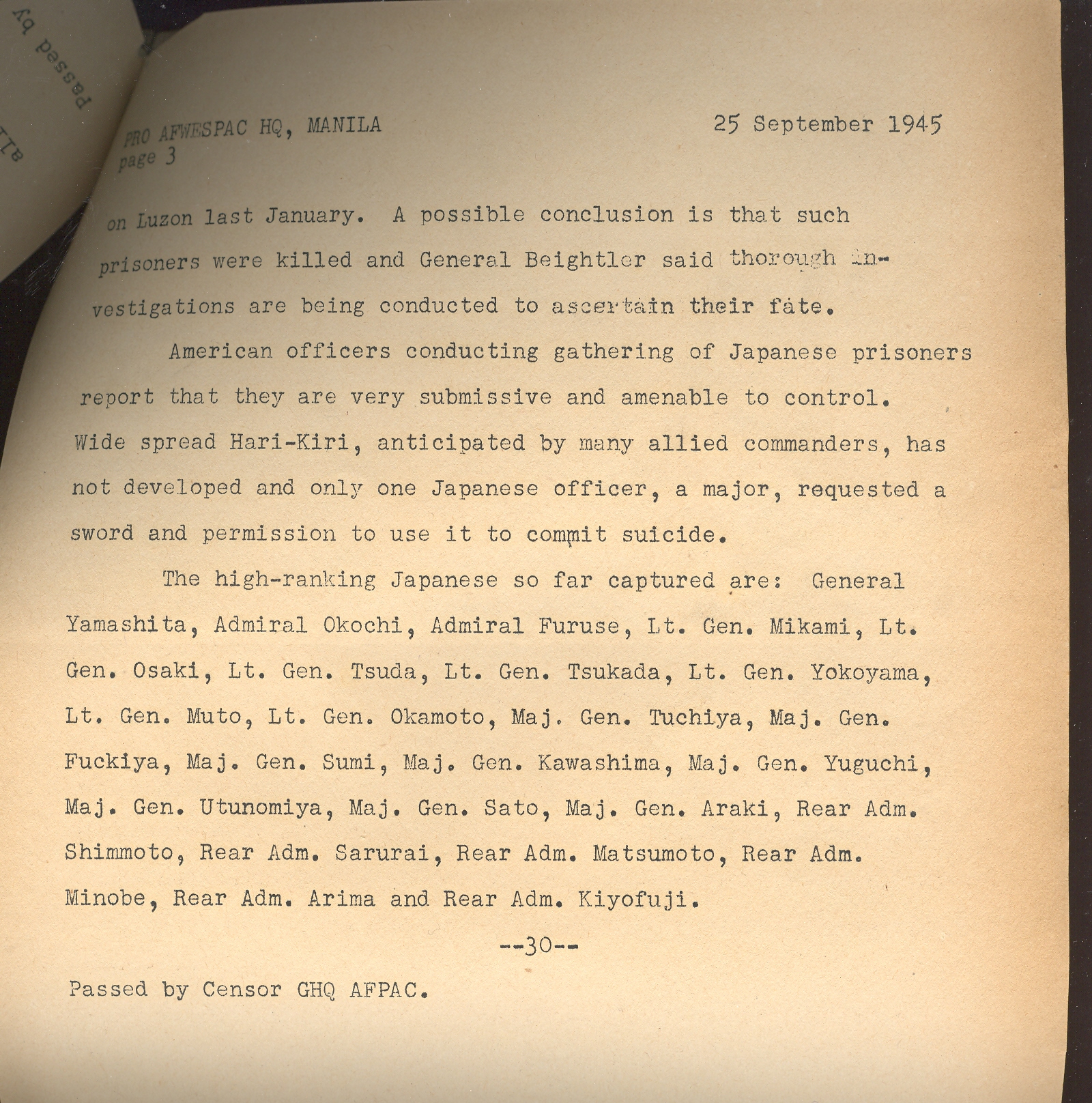 This short document relates the story of the capture of the last of the Japanese forces in Luzon, including the capture of some 40,000 troops, including General Yamashita ("The Tiger of Malaya") and soon-to-be-executed war criminal and beast of Manila.