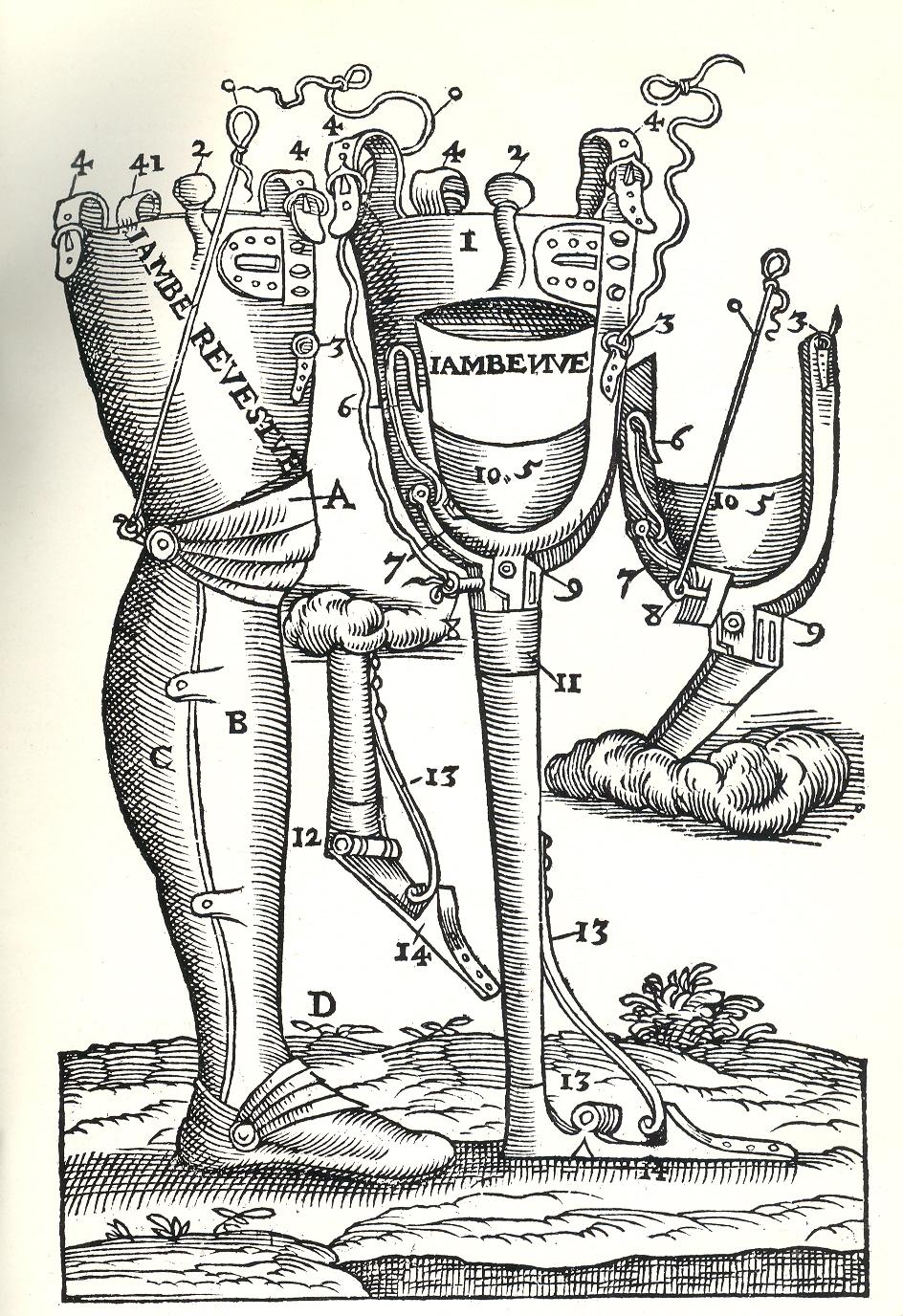 This busy and still beautifully designed woodcut from Amrbose Pare’s Opera Chirurgica… was printed in 1594 and holds special fascinations for me. First of all it is a pioneering work on artificial limbs, and secondly, and tritely, I like the floating ribbons and ties (some of which seem to come from clouds). First on Pare (1510-1590): this was a revolutionary work of an extraordinary figure (even though there are some who suspected that not all of this book was his own work) and was the greatest surgeon of his era and the doctor to four kings. He was responsible for the invention of numerous surgical instruments; he also re-introduced the ligature into surgical procedures for amputations, wrote on carbon monoxide poisoning, introduced the introduction of induced labor, created the reimplantation of teeth, was a pioneer of treating battlefield wounds and was one of the first to write on medical ethics and jurisprudence, and much else.