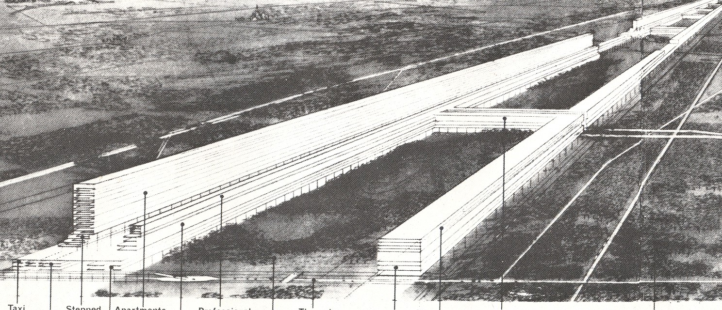 Michael Graves also proposed a linear city [aerial perspective below] to form a contiguous, living corridor between New Brunswick and Trenton, and alluded to the development of "consequent new patterns of life" though doesn't say what they might be.