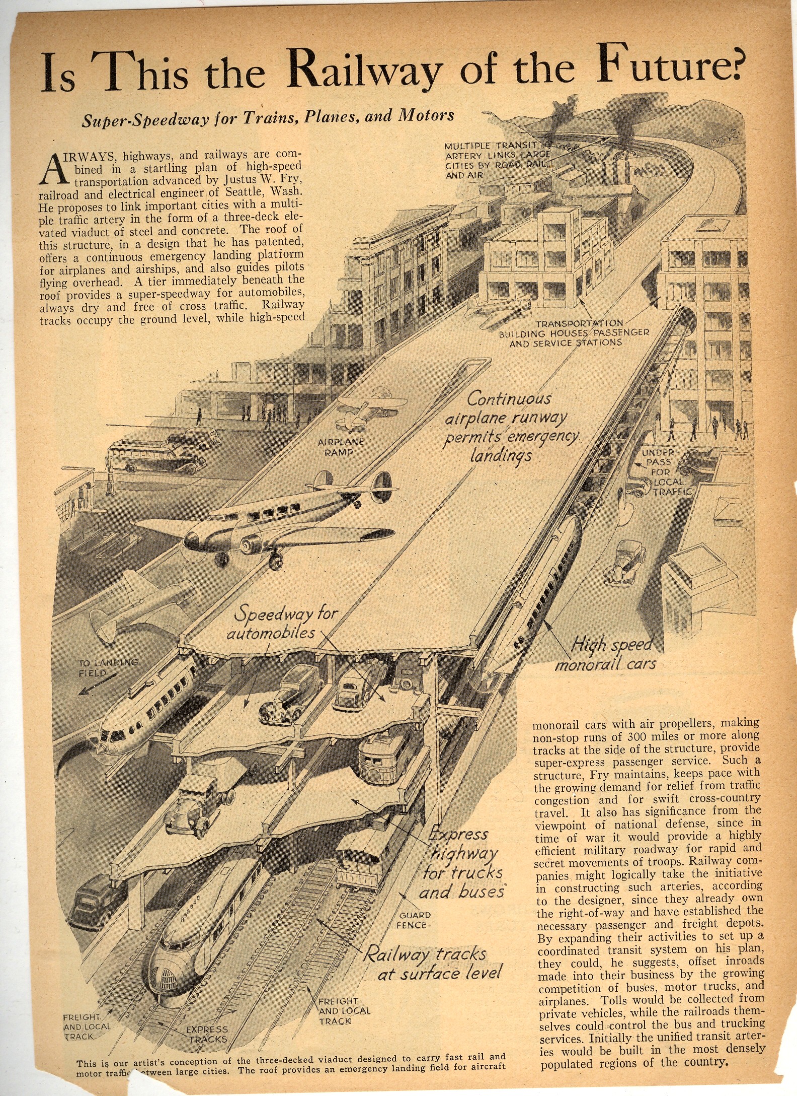 And certainly there have been many plans for incorporating, engulfing, transportation systems into the very fabric of a city (as seen in the "Is This the Railway of the Future" image that ran in Popular Science in 1932), though the idea of combining transportation and the city itself into a linear creation is far more uncommon.
