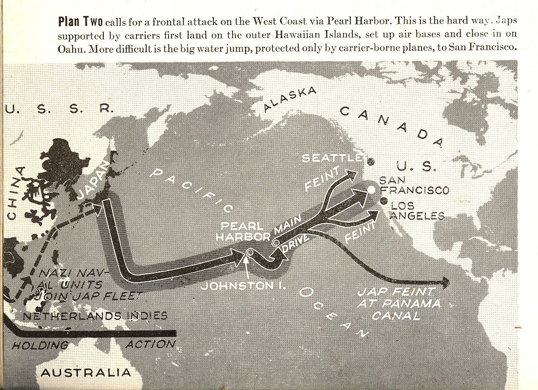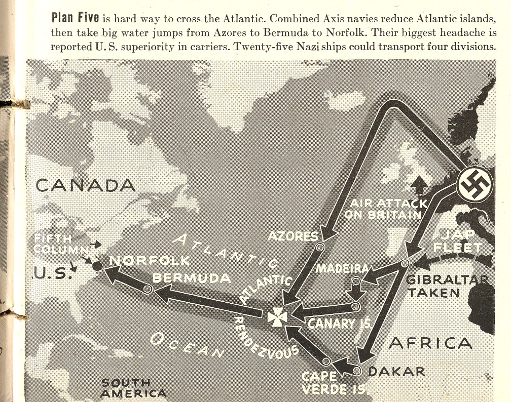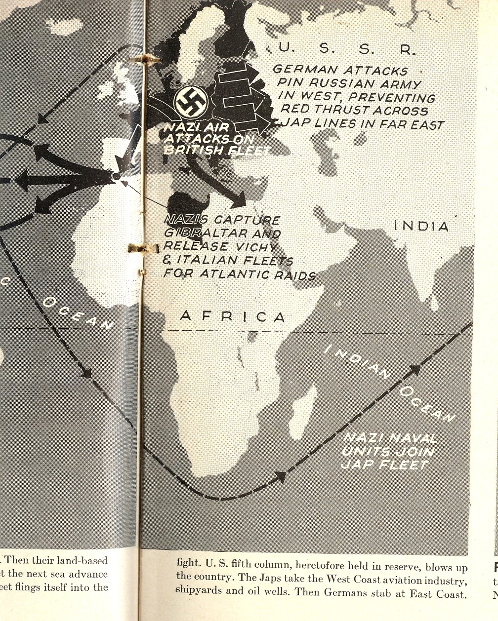 The following maps appeared in a two-page spread, detailing ways in which the Axis powers could combine their efforts, focus on America, and take over the country. Maps such as these with arrows being drawn towards America were absolutely uncommon during this time.