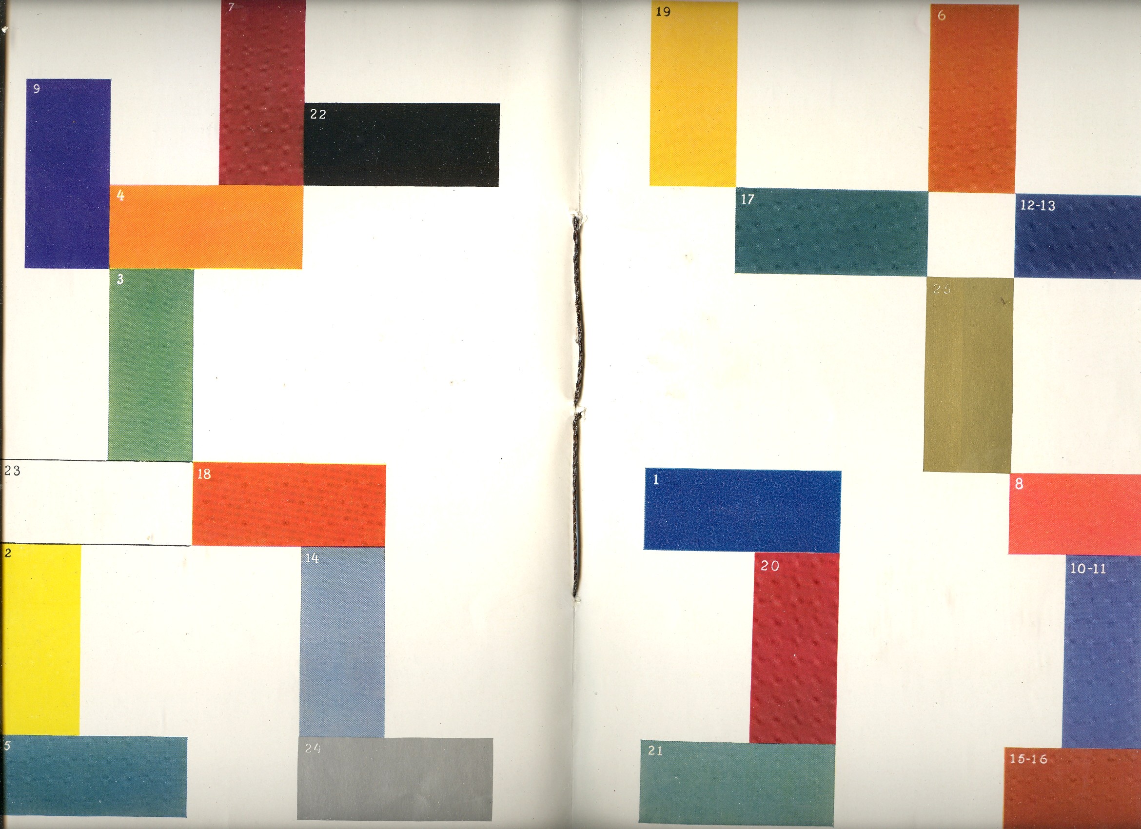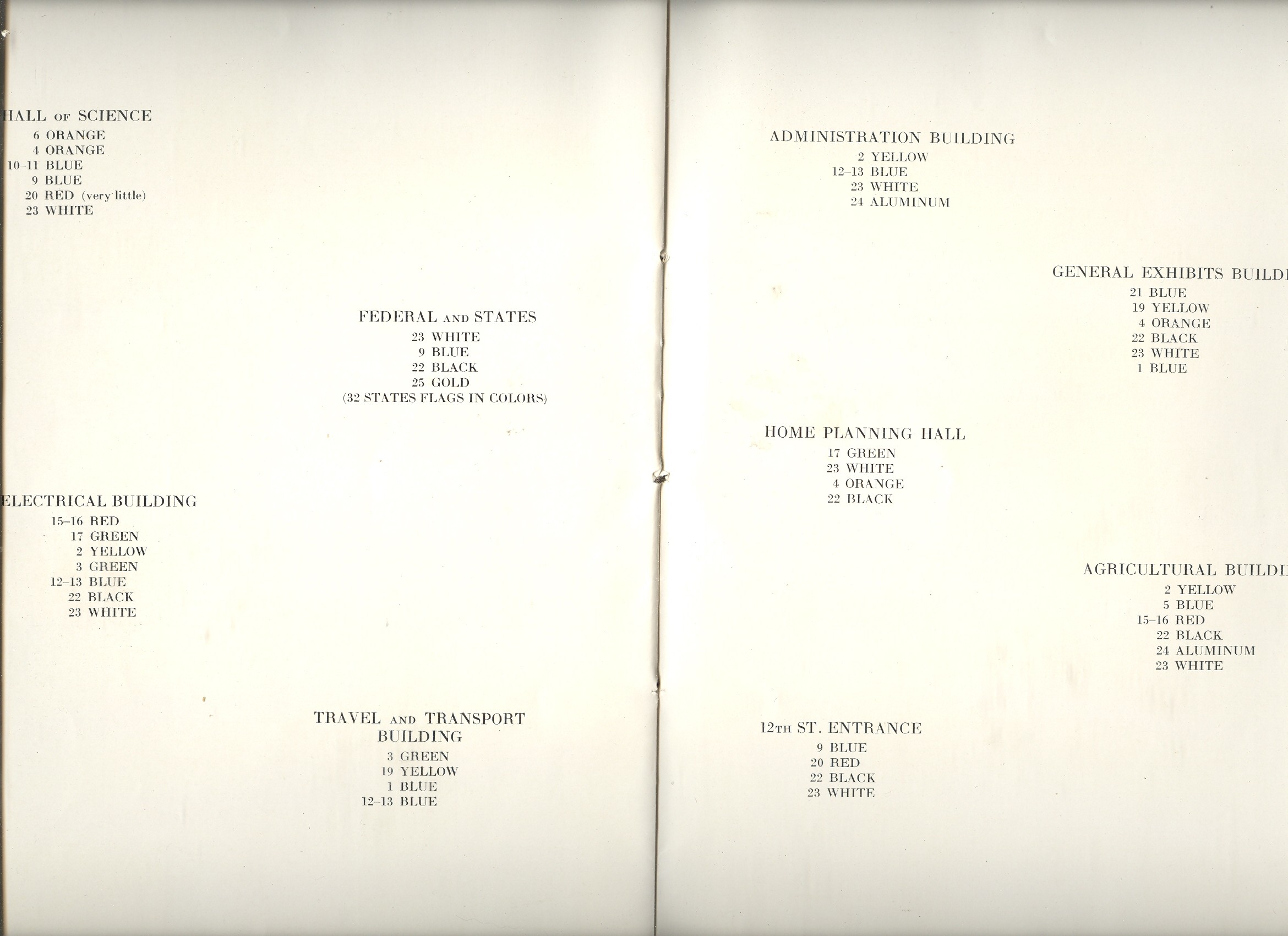 The first map fit is featured in a beautiful pamphlet called A Century of Progress Colors and was issued by the Textile Color Card Association of the USA.(The title being a small play on the 1933 world’s fair in Chicago called “A Century of Progress”. The Textile Color Card Association was created to standardize color nomenclature and composition in industrial colors (and is still in existence.) The map distributed the major pavilions at the fair by their dominating colors, naming those colors in the unusually-sequenced double-page key on the following pages (below1). I can certainly appreciate the effort and the beautiful design it produced, but as a map of the fair it leaves much (if not everything) to be desired.