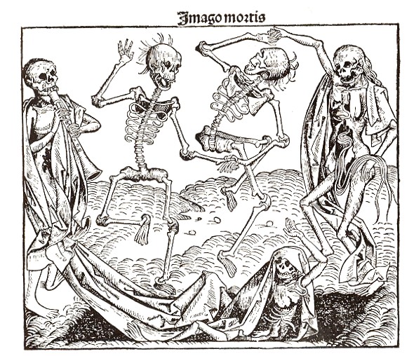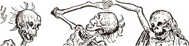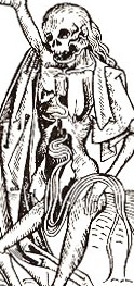 The Imago Mortis here is more like the Dance of Death, a subject visited many times by many great artists over a period of 500 years or so. But my interest right now is only in the hair; particularly the hair of the figure at far right, whose (her?) hair seems to be not only flowing down her spine but through it and her ricase as well, spilling out in front of her across her pelvis.