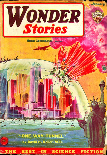 Then there's this magnificent cover for November, 1929, featuring a tentacled flying saucer removing the Woolworth Building into outer space (as well as the Eiffel Tower by another brethern craft (the Earth appearing again, as nearly usual, without cloud cover):