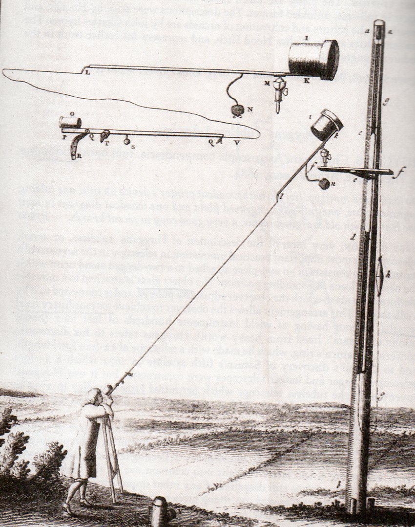 Getting back to the telescope–its missing section was perhaps one of the most important developments in astronomy in the second half of the 17th century. Its arrangement was very elegant, and simple–the mast held the object glass whose position could be changed with a series of simple pulleys and pulls; the eyepiece was placed on a table, aligned with string and rope. And that was it. By the first third of the 18th century, James Bradley was able to construct a telescope of this type with a focal length of 212 feet, and used it to measure the diameter of Venus.