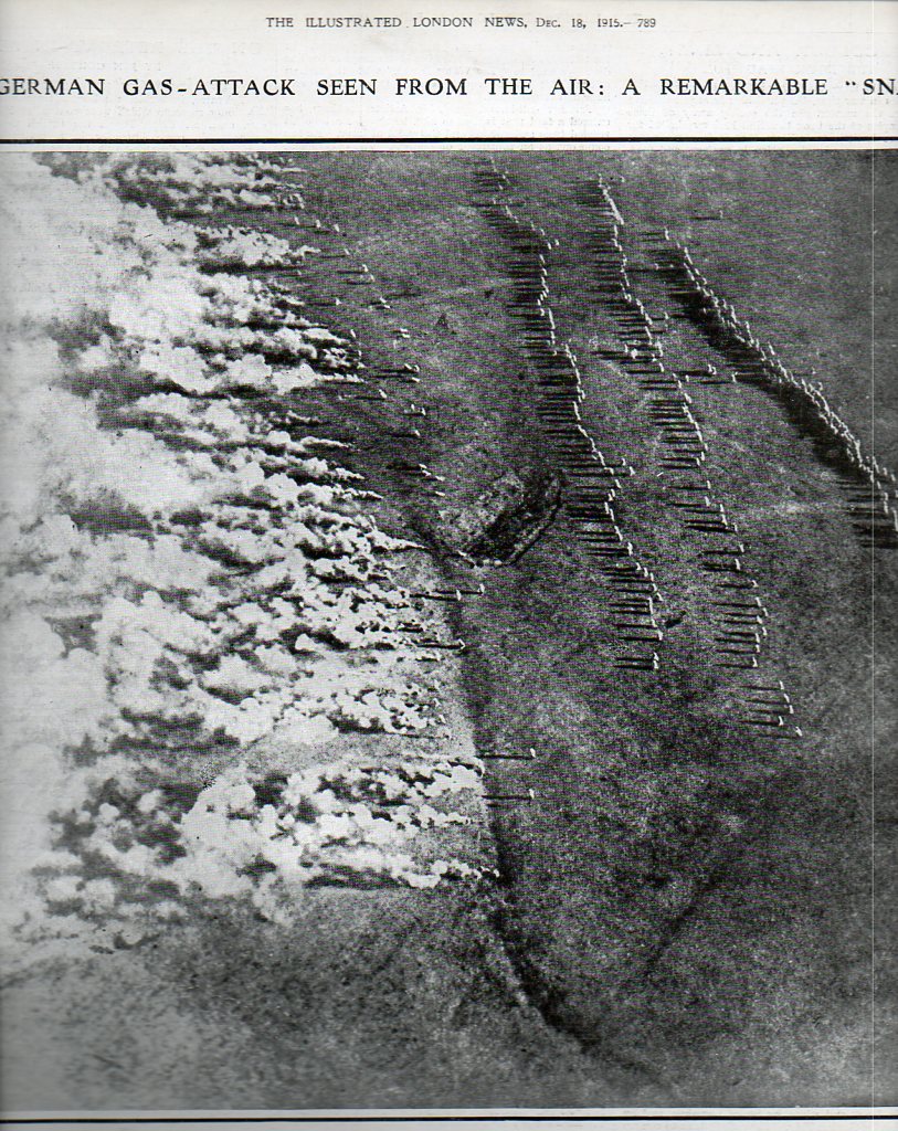 The heading of this full-page photo from The Illustrated London News for 18 December 1915 really is quite understated—“remarkable” really doesn’t quite cover it. First of all, photographs from moving airplanes were not common; secondly, this is one of the earliest images ever made of a poison gas attack in progress, just eight months after the initial use of German poison gas at Ypres (a first-hand account of which can be seen here http://www.firstworldwar.com/diaries/firstgasattack.htm The experience of poison gas in warfare was still “new”–newer still for the Russians, who were at the receiving end of this unnamed Eastern Front attack.