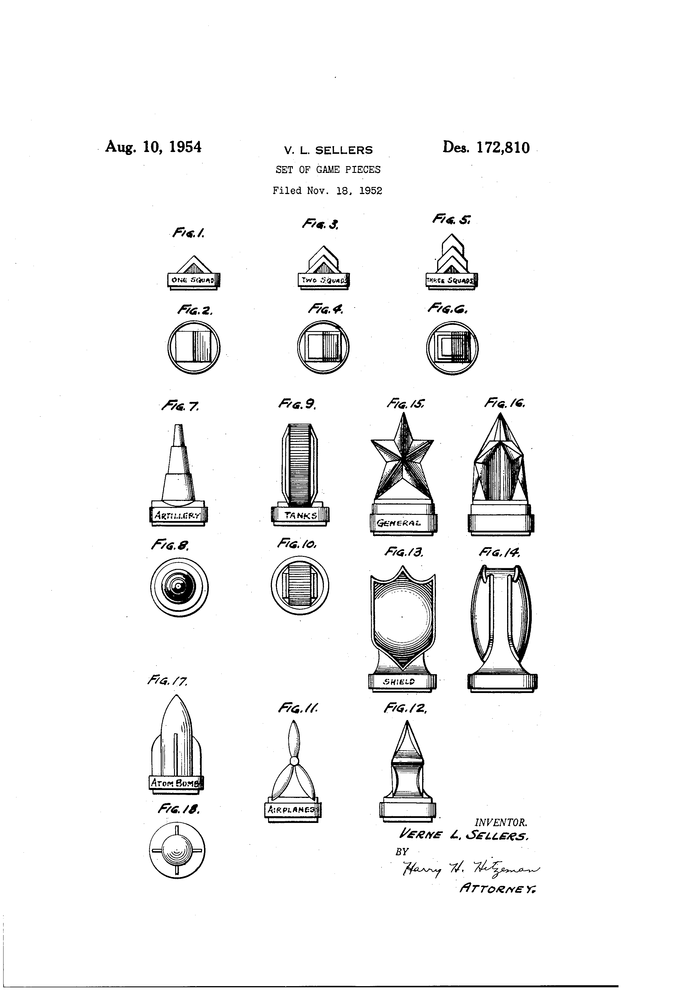 Does these things, below, seem appropriate to you? Take for example a simple matter in this detail from a U.S. Patent Office report for game pieces for a board game--the pieces were described; the game wasn't. The inventor, Verne Sellers, provided tanks, artillery, an air power of some sort, a "shield", a general, a few undesignated items, and of course an atom bomb. The atom bomb would make things all right.