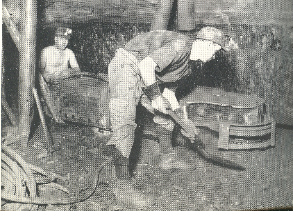 "It is impossible to watch the 'fillers' at work without feeling a pang of envy for their toughness. It is a dreadful job that they do, an almost superhuman job by the standard of an ordinary person. For they are not only shifting monstrous quantities of coal, they are also doing, it in a position that doubles or trebles the work. They have got to remain kneeling all the while--they could hardly rise from their knees without hitting the ceiling--and you can easily see by trying it what a tremendous effort this means. Shoveling is comparatively easy when you are standing up, because you can use your knee and thigh to drive the shovel along; kneeling down, the whole of the strain is thrown upon your arm and belly muscles. And the other conditions do not exactly make things easier. There is the heat--it varies, but in some mines it is suffocating--and the coal dust that stuffs up your throat and nostrils and collects along your eyelids, and the unending rattle of the conveyor belt, which in that confined space is rather like the rattle of a machine gun. But the fillers look and work as though they were made of iron. They really do look like iron hammered iron statues--under the smooth coat of coal dust which clings to them from head to foot. It is only when you see miners down the mine and naked that you realize what splendid men, they are. Most of them are small (big men are at a disadvantage in that job) but nearly all of them have the most noble bodies; wide shoulders tapering to slender supple waists, and small pronounced buttocks and sinewy thighs, with not an ounce of waste flesh anywhere. In the hotter mines they wear only a pair of thin drawers, clogs and knee-pads; in the hottest mines of all, only the clogs and knee-pads. You can hardly tell by the look of them whether they are young or old. They may be any age up to sixty or even sixty-five, but when they are black and naked they all look alike. No one could do their work who had not a young man's body, and a figure fit for a guardsman at that, just a few pounds of extra flesh on the waist-line, and the constant bending would be impossible. You can never forget that spectacle once you have seen it--the line of bowed, kneeling figures, sooty black all over, driving their, huge shovels under the coal with stupendous force and speed. They are on the job for seven and a half hours, theoretically without a break, for there is no time 'off'. Actually they, snatch a quarter of an hour or so at some time during the shift to eat the food they have brought with them, usually a hunk of bread and dripping and a bottle of cold tea. The first time I was watching the 'fillers' at work I put my hand upon some dreadful slimy thing among the coal dust. It was a chewed quid of tobacco. Nearly all the miners chew tobacco, which is said to be good against thirst.