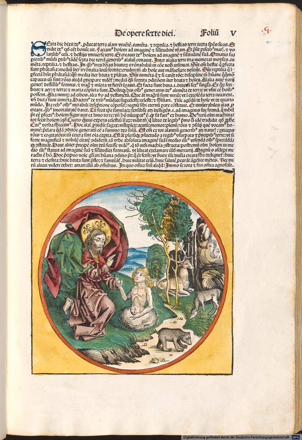 The book was written in Latin by Hartmann Schedel (1444-1514, with the German translation by Georg Alt) , with the illustrations under the control of Michael Wohlgemut (1434-1519) and his stepson Wilhelm Pleydenwurff (c. 1450-1494), .and was published in Nuremberg in 1493 by Anton Koberger as Liber Chronicarum--known best to English-pseaking readers as the Nuremberg Chronicles (and to Germans as Die Schedelsche Weltchronik). It is perhaps one of the greatest illustrated works in the first half-century of movable type printing, using more than 1800 woodcuts to tell the story of the world--according to the Bible, mostly. (The book deals with the history of world in its seven ages--the first five of which deal with cumuulative history to the birth of Jesus Christ, while the sixth ages handles the history from Christ to the present day, and teh seventh carries along the future history of the world to the Last Judgment. Not much then is devoted to the 1500 years preceding the publication of Koberger's book. The author, Schedel, was a very religious man, and considered the work of teh Bible to come from the hand of god and therefore was infallible; on the other hand (so to speak), everything written outside of the Bible was that of humans, and so fallible, and therefore open to interpretation.)