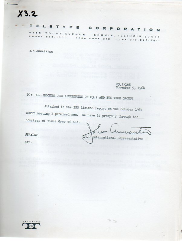 --______. Report on Meeting of CCITT, Working Group on Alphabets, 2 November 1964. 8pp+9pp, stapled.