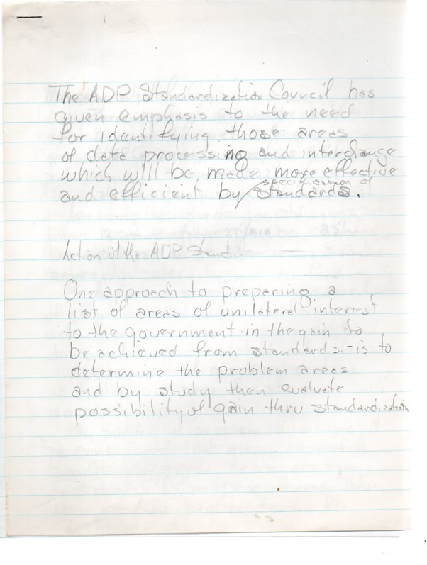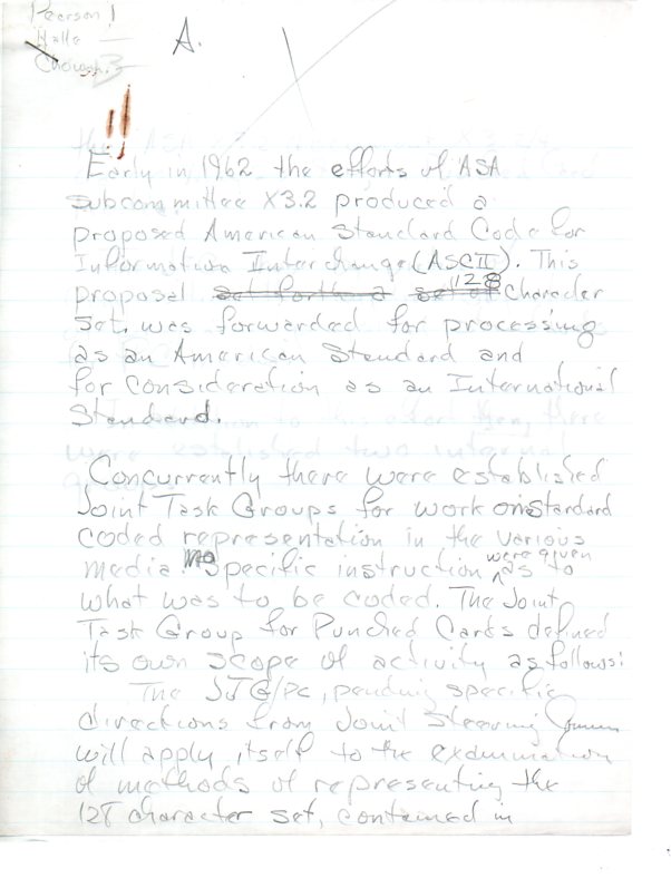 --The American Standard Code for Information Interchange (ASCII)...6pp, manuscript in pencil, loose leaf sheets. Stapled. Ca. 1963/4.