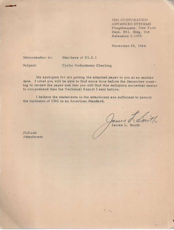 --Memorandum X3.2.1. Cyclic Redundancy Checking. IBM Corporation Advanced Systems, Poughkeepsie,m New York. 20 November 1964. 8pp.